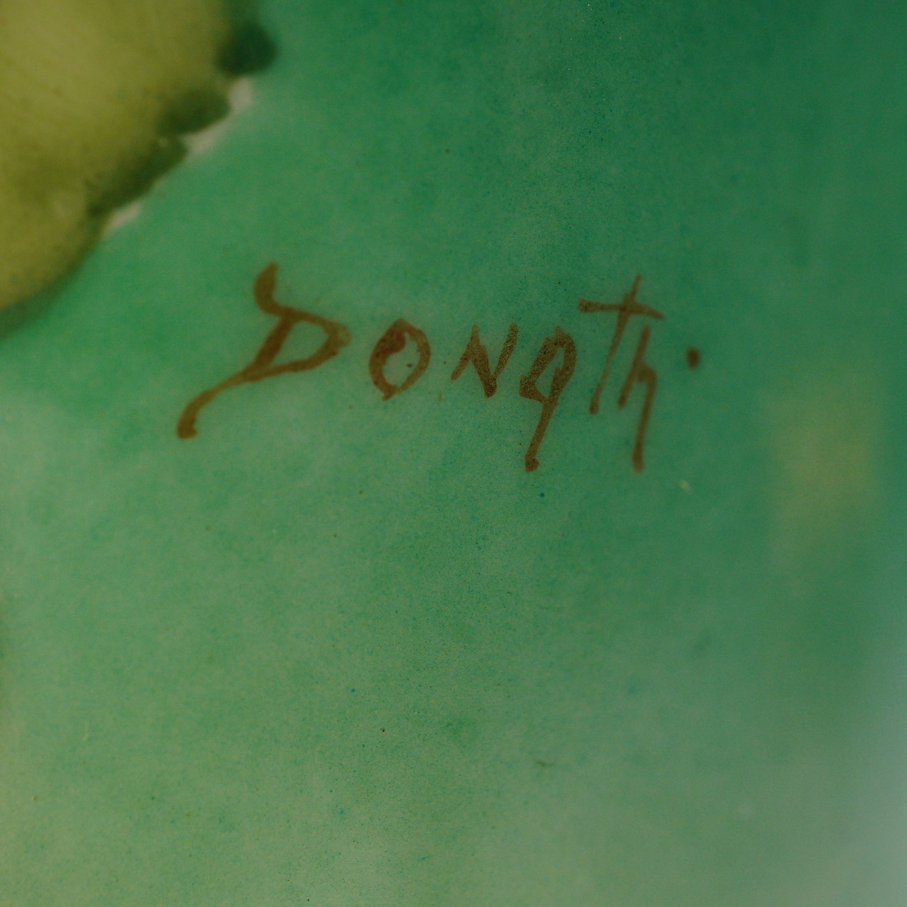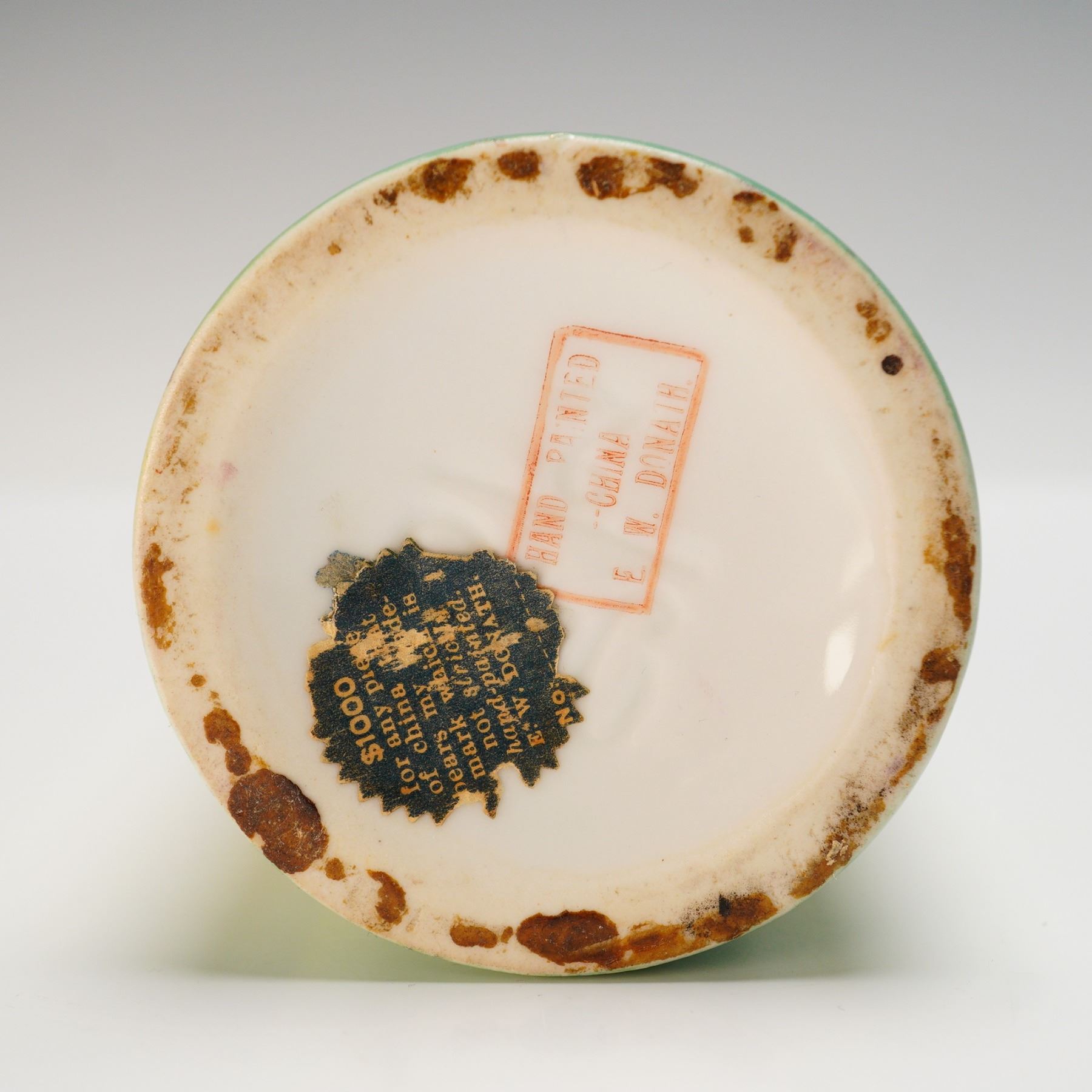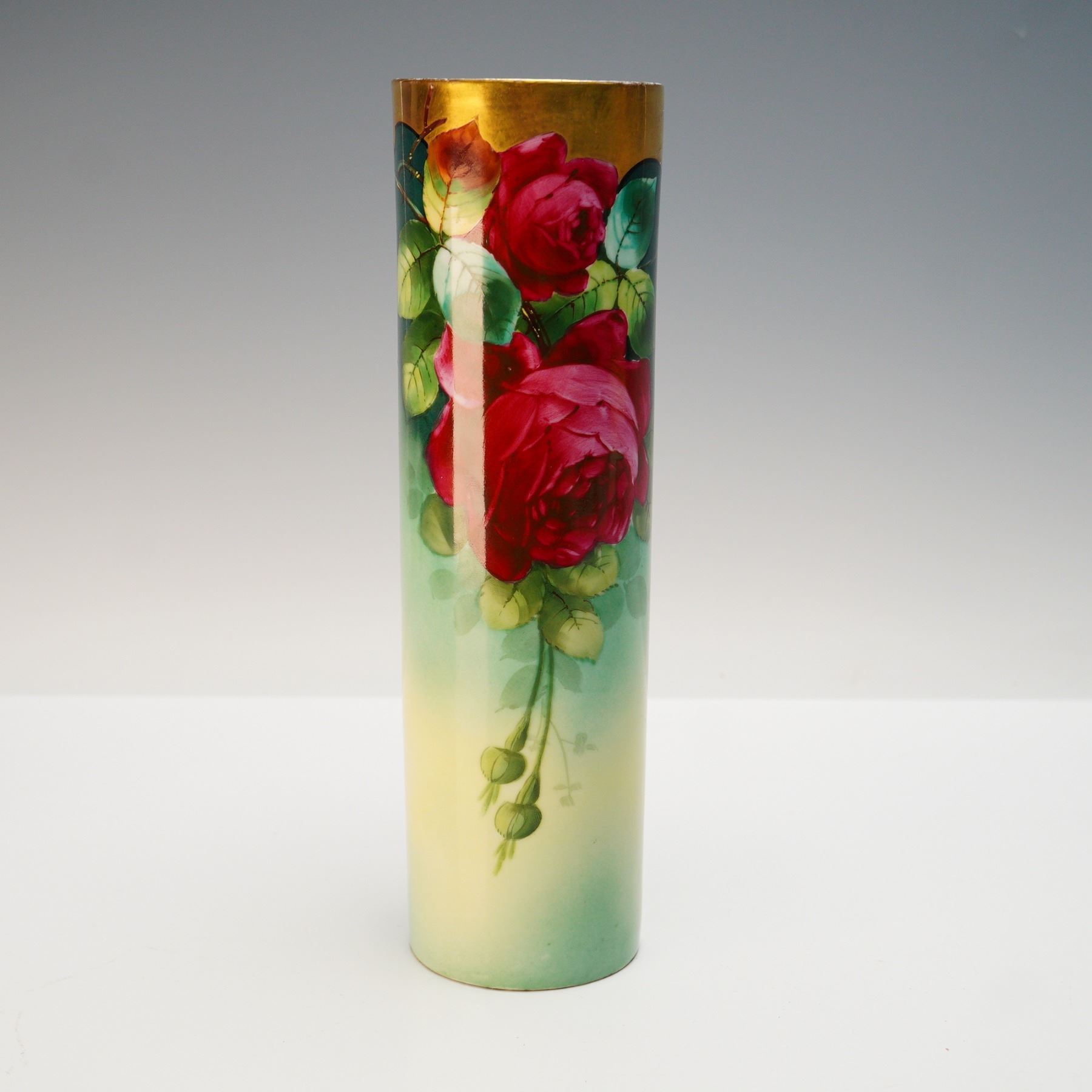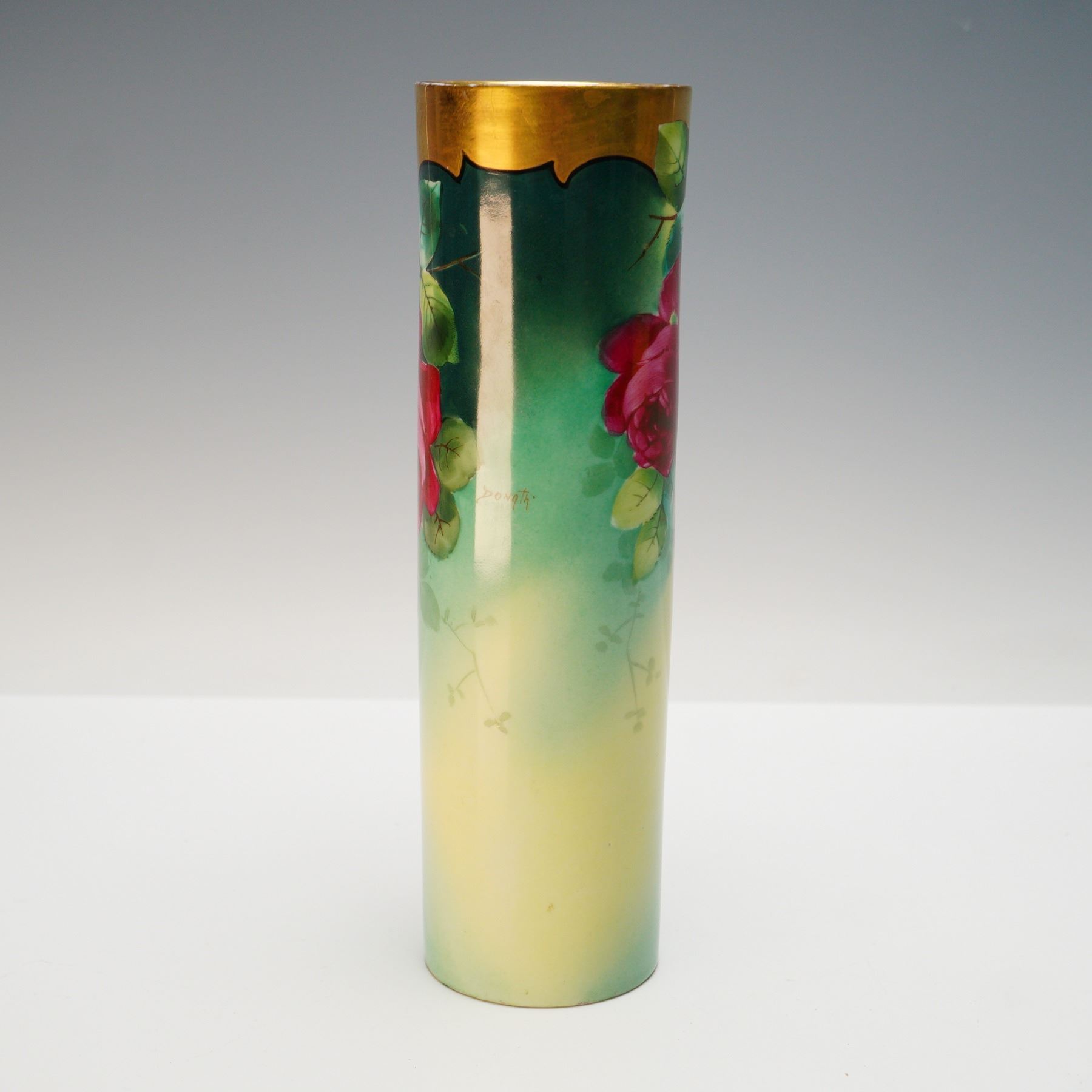 A finely hand painted porcelain cylinder vase signed Donath, attributed to the E. & W. Donath Studio of New York, active during the early 20th century. The tall, cylindrical form is decorated with lush crimson roses against a gradient ground that fades from rich green at the top to soft butter yellow at the base. The top rim is finished with a wide band of burnished gold, adding elegance and contrast to the naturalistic floral design. The underside bears the red stamped mark "Hand Painted - China - E. & W. Donath", as well as remnants of the original retailer's paper label. Donath was a highly regarded decorating studio that produced fine hand-painted china for the American market, often working on blank porcelain imported from Europe. This vase is an excellent example of early 20th-century American hand-painted porcelain artistry, appealing to collectors of Donath Studio and Art Nouveau floral designs.