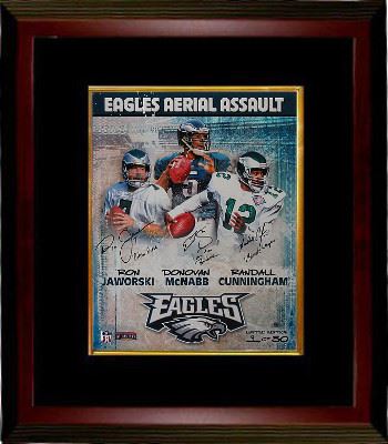 Ron Jaworski finished his 17 season career with 2,187 completions on 4,117 attempts for 28,190 yards, 179 touchdowns, and 164 interceptions. At one time he held the record for most consecutive starts by a quarterback with 116 having since been surpassed by Brett Favre and Peyton Manning. For his career, Donovan McNabb has led Philadelphia to 5 NFC East crowns, 5 NFC championship games and one Super Bowl appearance. Randall Cunningham was the Eagles' second-round pick in the 1985 NFL Draft. He was a 4 Time Pro Bowl selection and 4 Time All-Pro selection. This Philadelphia Eagles Aerial Assault 16x20 Photo has been hand signed by Ron Jaworski with Polish Rifle inscription, Donavan McNabb with 6X Pro Bowler & Randall Cunningham with Ultimate Weapon inscription. Limited Edition of 50. Certificate of Authenticity from Athlon Sports Collectibles. Custom Black Mat and Premium Mahogany Color Framed as shown.