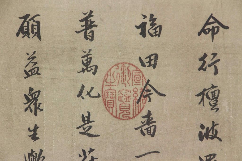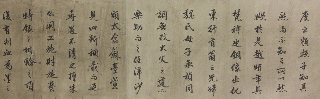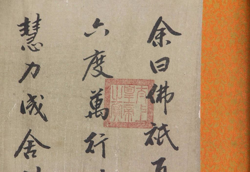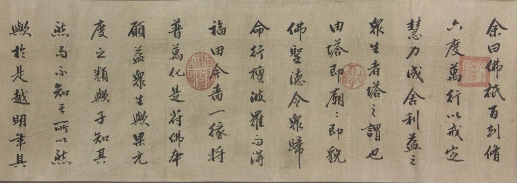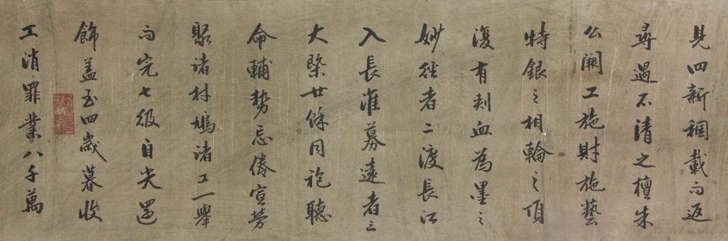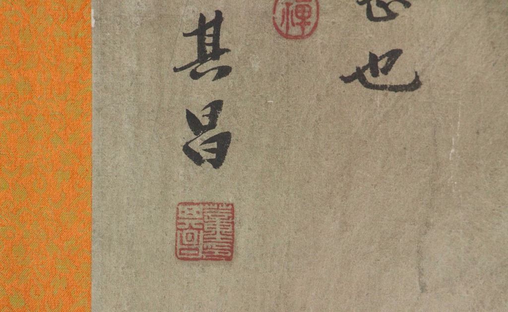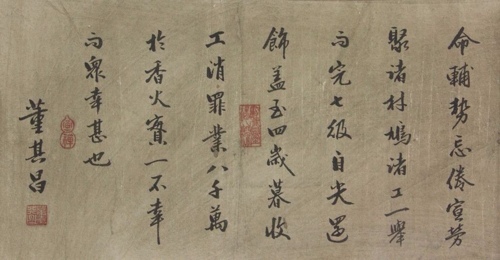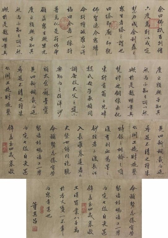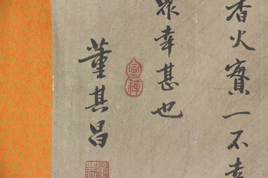 Chinese calligraphy; Chinese ink on paper; long hand scroll; signed Dong Qichang (1555-1636); inscribed with 2 artist seals; with 5 imperial connoisseur stamps including Emperor Qianlong (1711-1799), and Emperor Xuantong (1906-1967); 32 cm x 150 cm