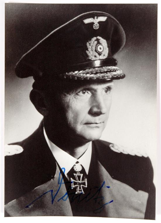 Dõnitz, Karl (1891-1980) German Grand Admiral who built up their submarine fleet and commanded the German navy. He briefly succeeded Hitler, then on May 8, 1945, signed Nazi Germany's unconditional surrender to the Allies. He was convicted of war crimes at Nuremberg and served ten years in Spandau Prison. Photograph signed "Dönitz" at lower edge in blue ink, 5¾ 4 1/8 in., n.p., n.d. A bust portrait in naval uniform. Very fine.