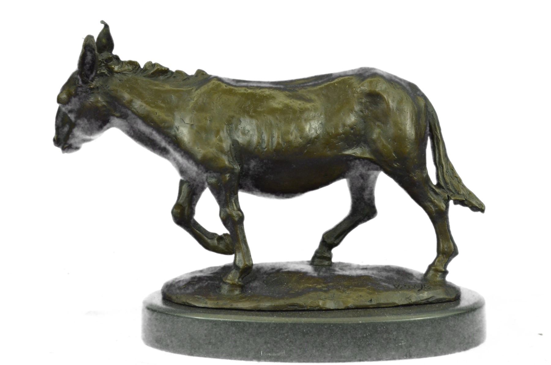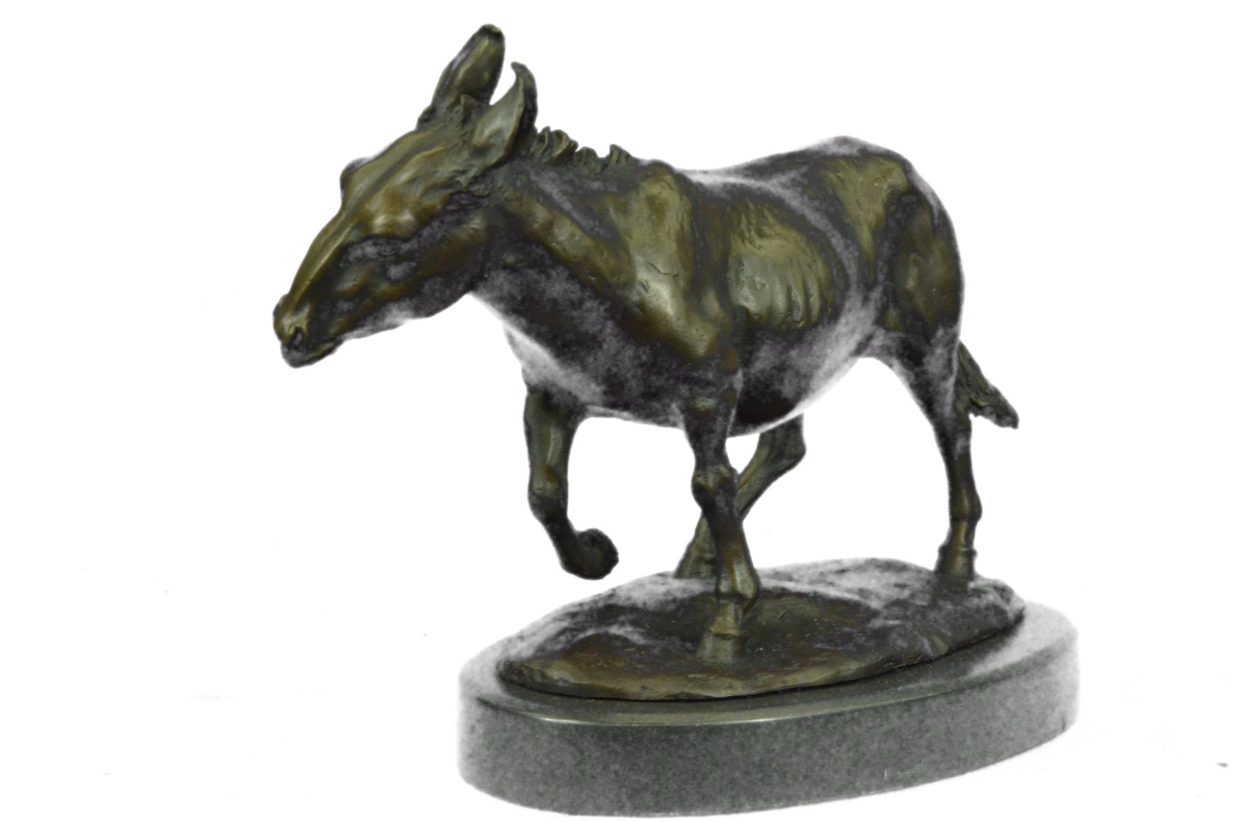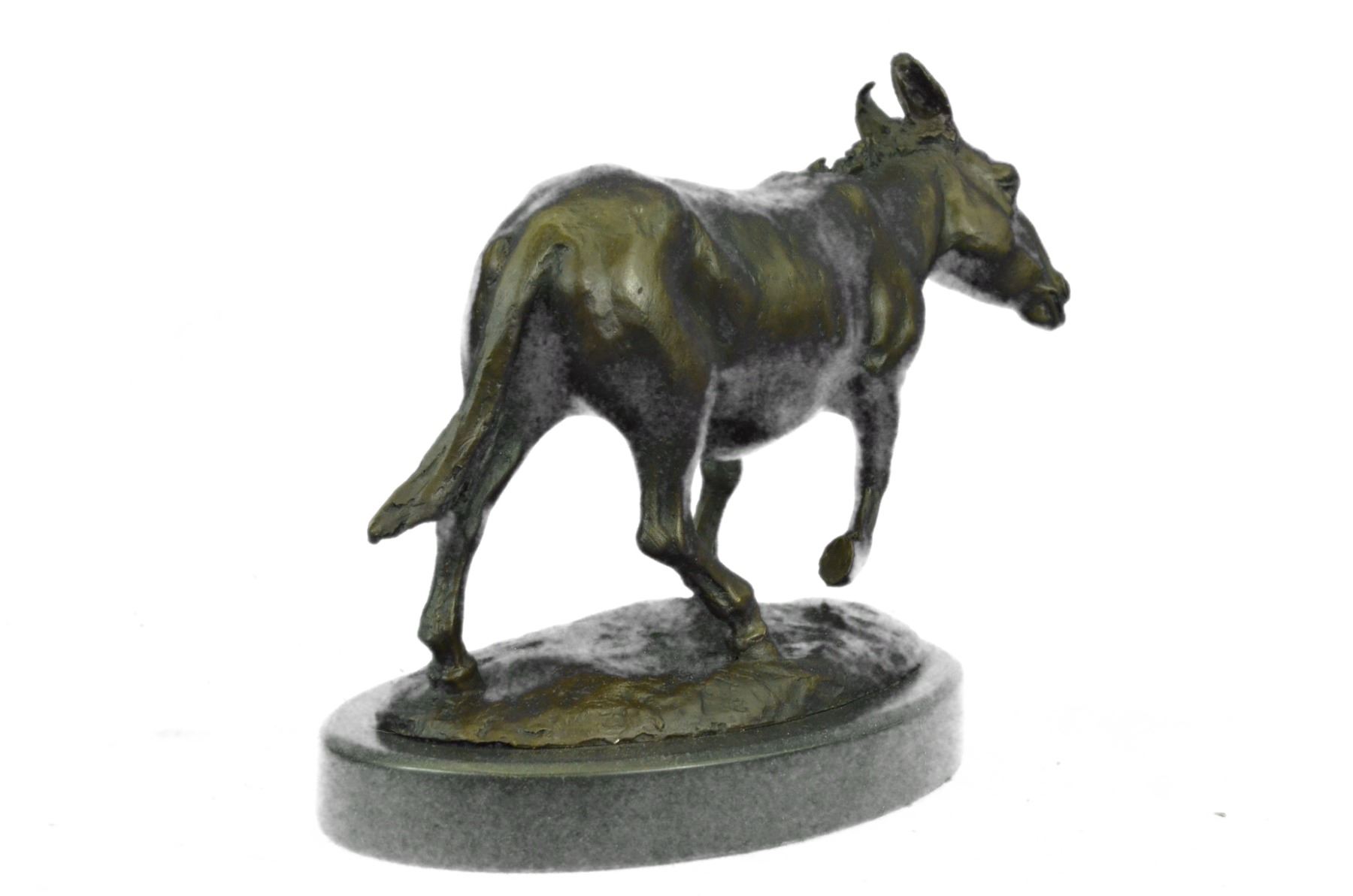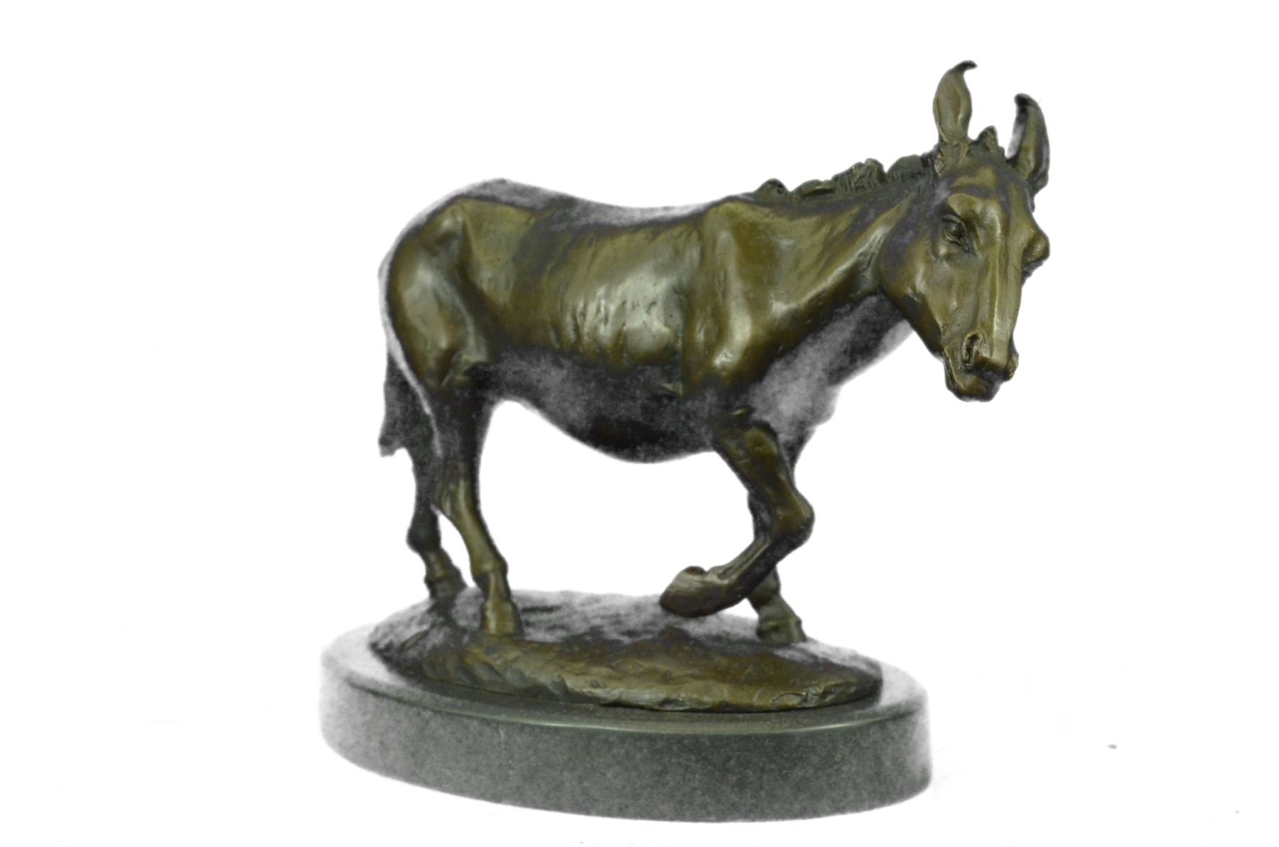 The donkey comes across in its natural and free state. With a jerk of the head and a cock of an ear, he notices the viewer and continues to trot along without the burden of a heavy package. This bronze sculpture was cast using the ancient method of lost-wax casting and stained with a brown patina finish for conservation and is mounted upon a marble base. Dimensions: Height 8 X Width 12 inches. Weight: 10 LBS.