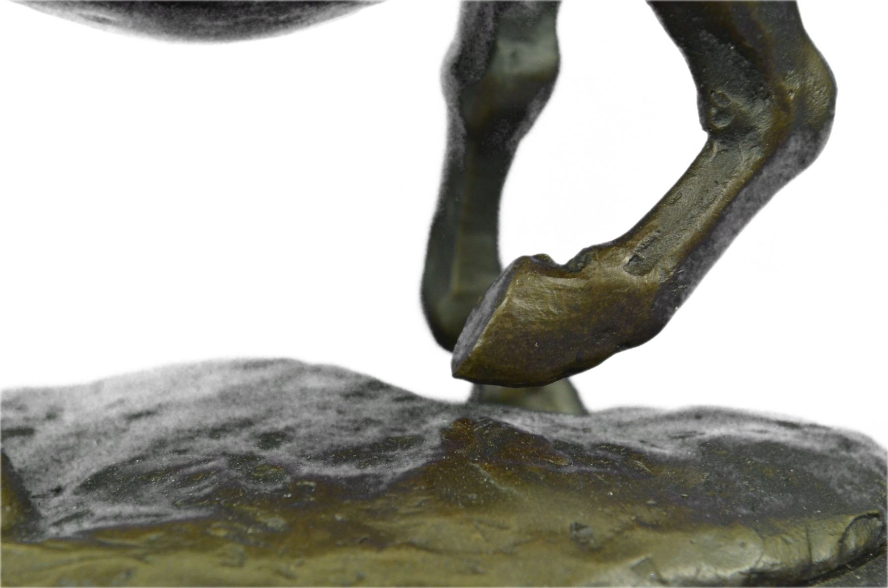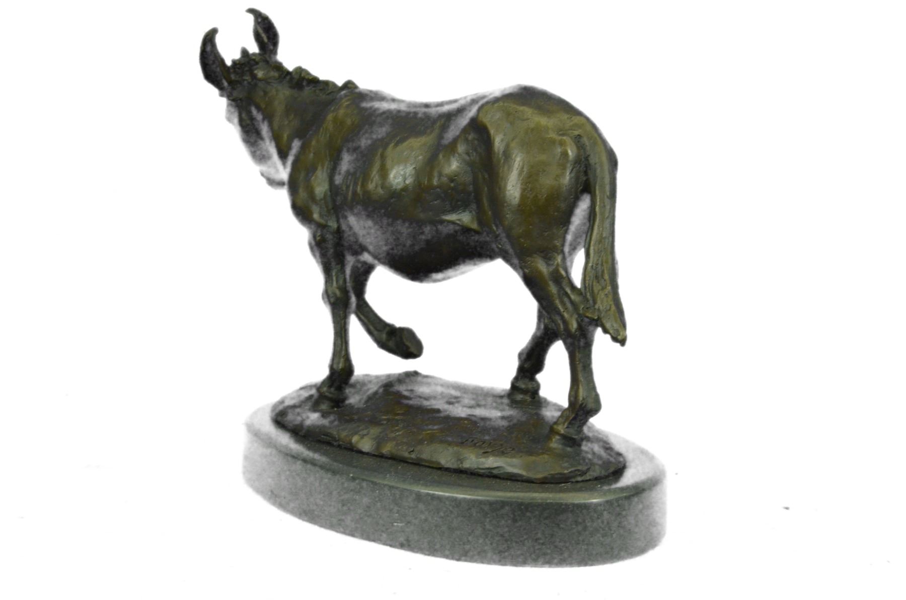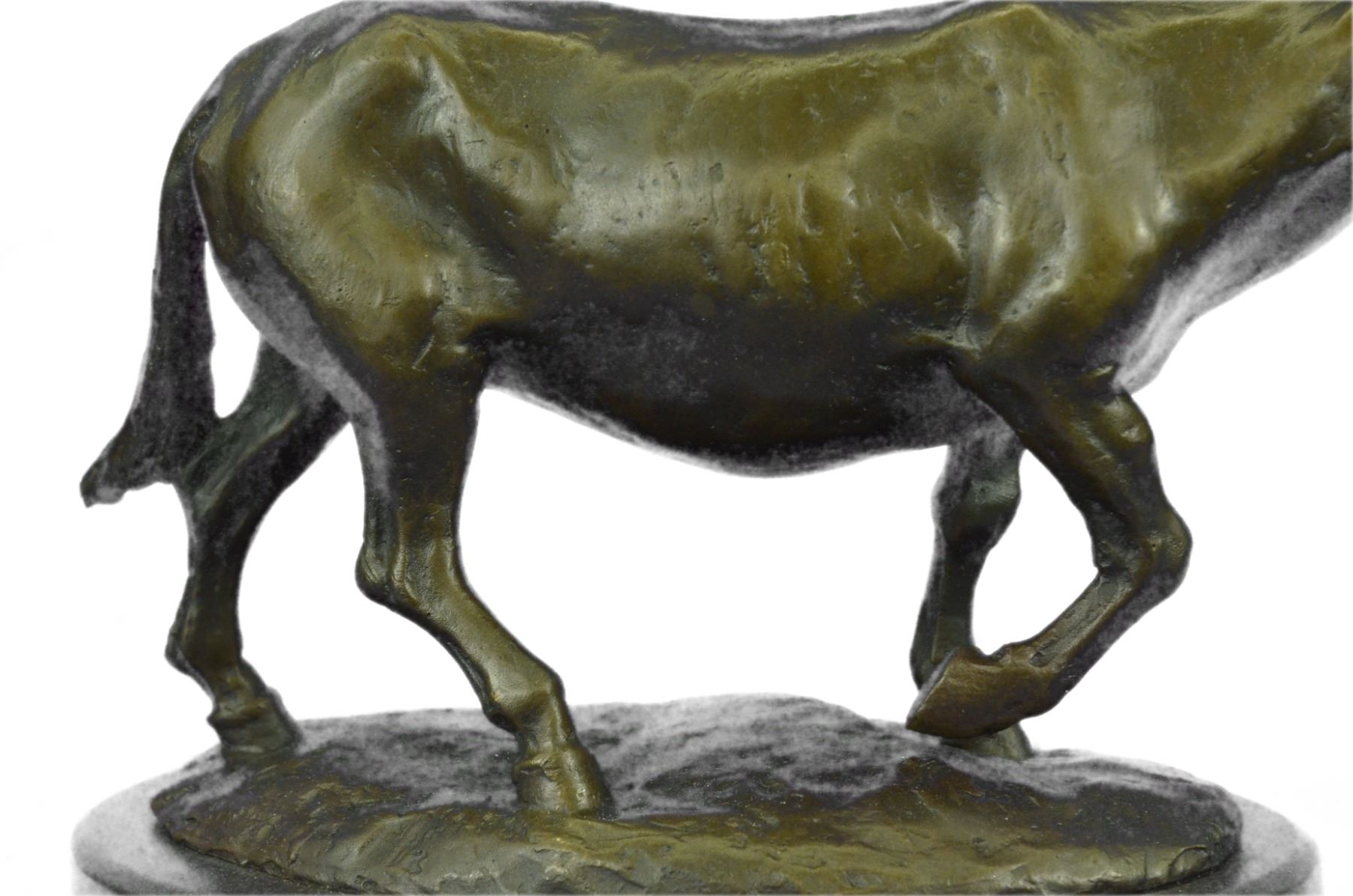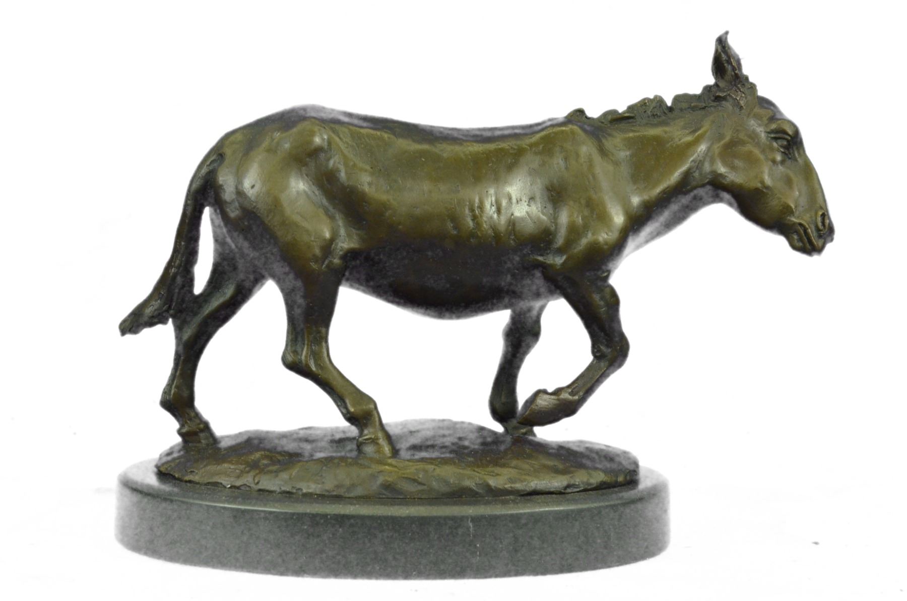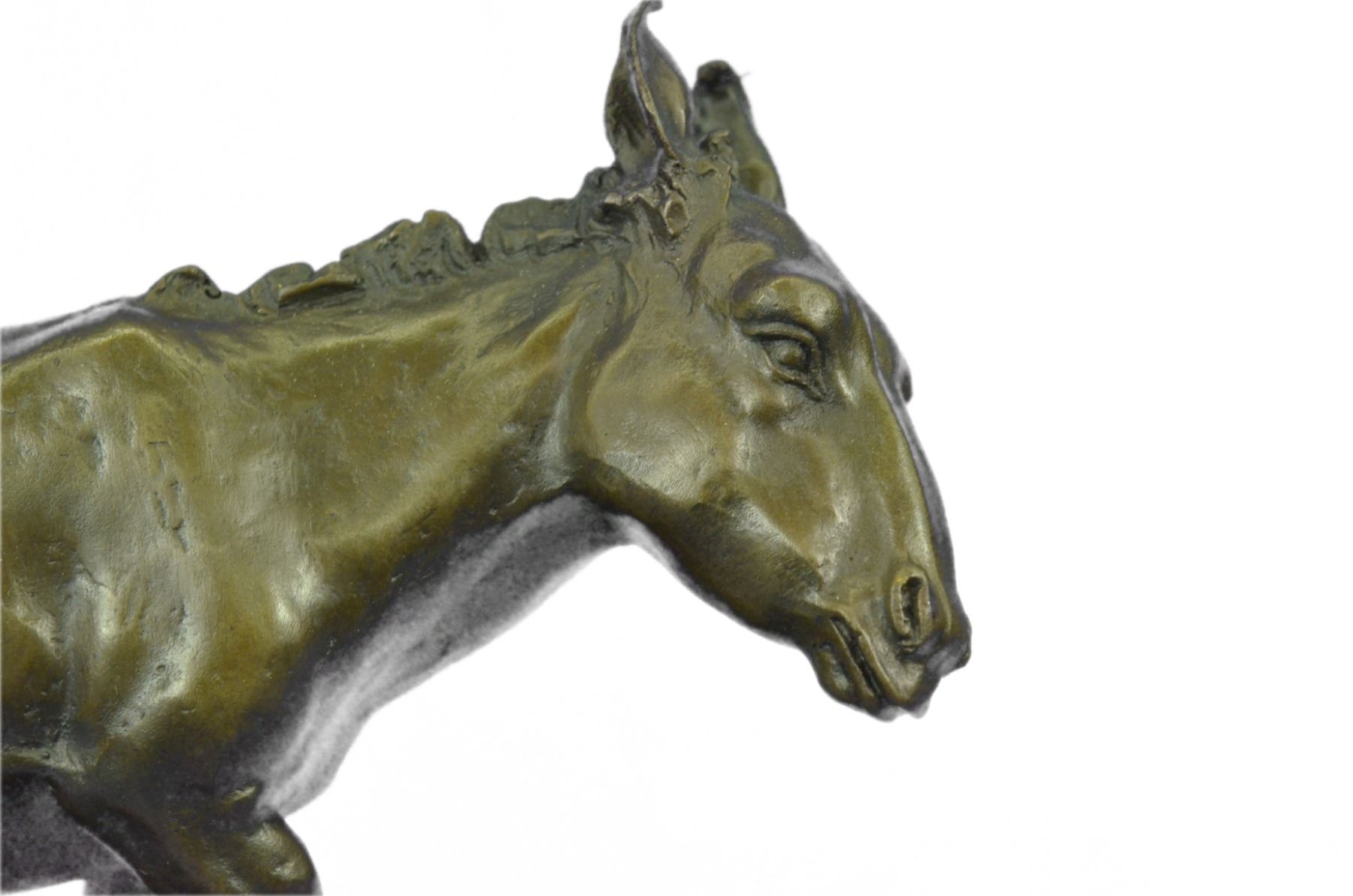 The donkey comes across in its natural and free state. With a jerk of the head and a cock of an ear, he notices the viewer and continues to trot along without the burden of a heavy package. This bronze sculpture was cast using the ancient method of lost-wax casting and stained with a brown patina finish for conservation and is mounted upon a marble base. Dimensions: Height 8 X Width 12 inches. Weight: 10 LBS.