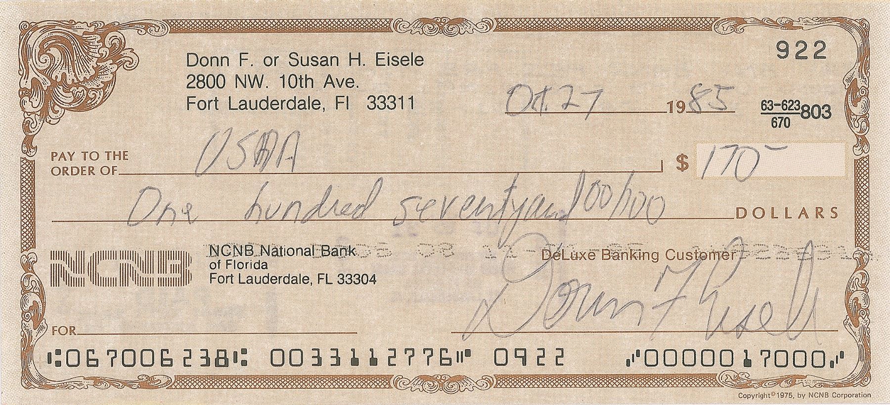 Personal check, 6 x 2.75, filled out and signed by Donn F. Eisele, payable to OSHA for $170, October 27, 1985. In fine condition.