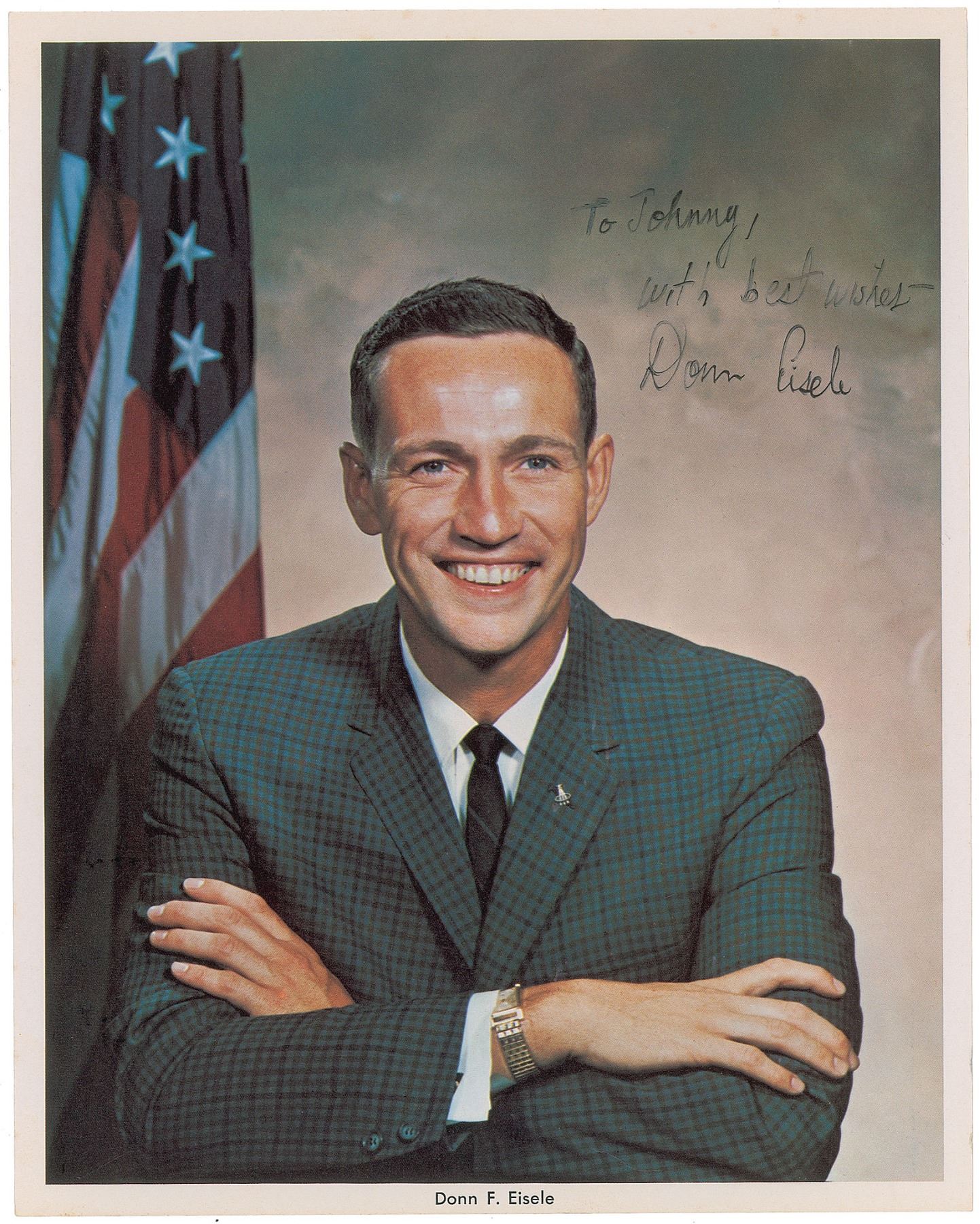 Scarce official color 8 x 10 NASA lithograph of the Apollo 7 command module pilot in a formal half-length pose, signed and inscribed in black felt tip, "To Johnny, with best wishes—Donn Eisele.” In very fine condition. Eisele was originally selected to be the pilot for the ill-fated Apollo 1 mission, but after suffering two shoulder dislocations during training, he was swapped out for Roger Chaffee.