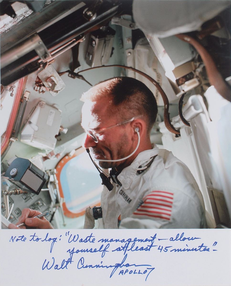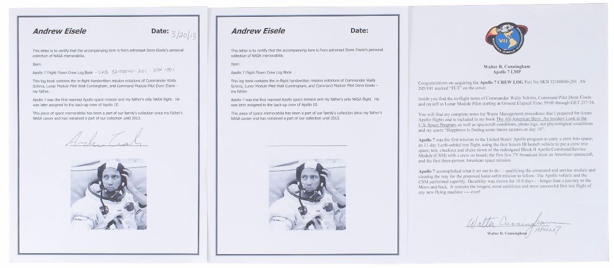Includes a color satin-finish 8 x 10 photo of Cunningham writing in the log book, signed in the lower border in blue felt tip, “Note to log: ‘Waste management—allow yourself at least 45 minutes.’ Walt Cunningham, Apollo 7.” In very good condition, with staining and foxing to cover and some inside pages (but interior mostly clean) and expected rusting to binder rings from age. Accompanied by a letter of provenance from Eisele’s son, Andrew Eisele, and an additional letter of authenticity signed by Cunningham.