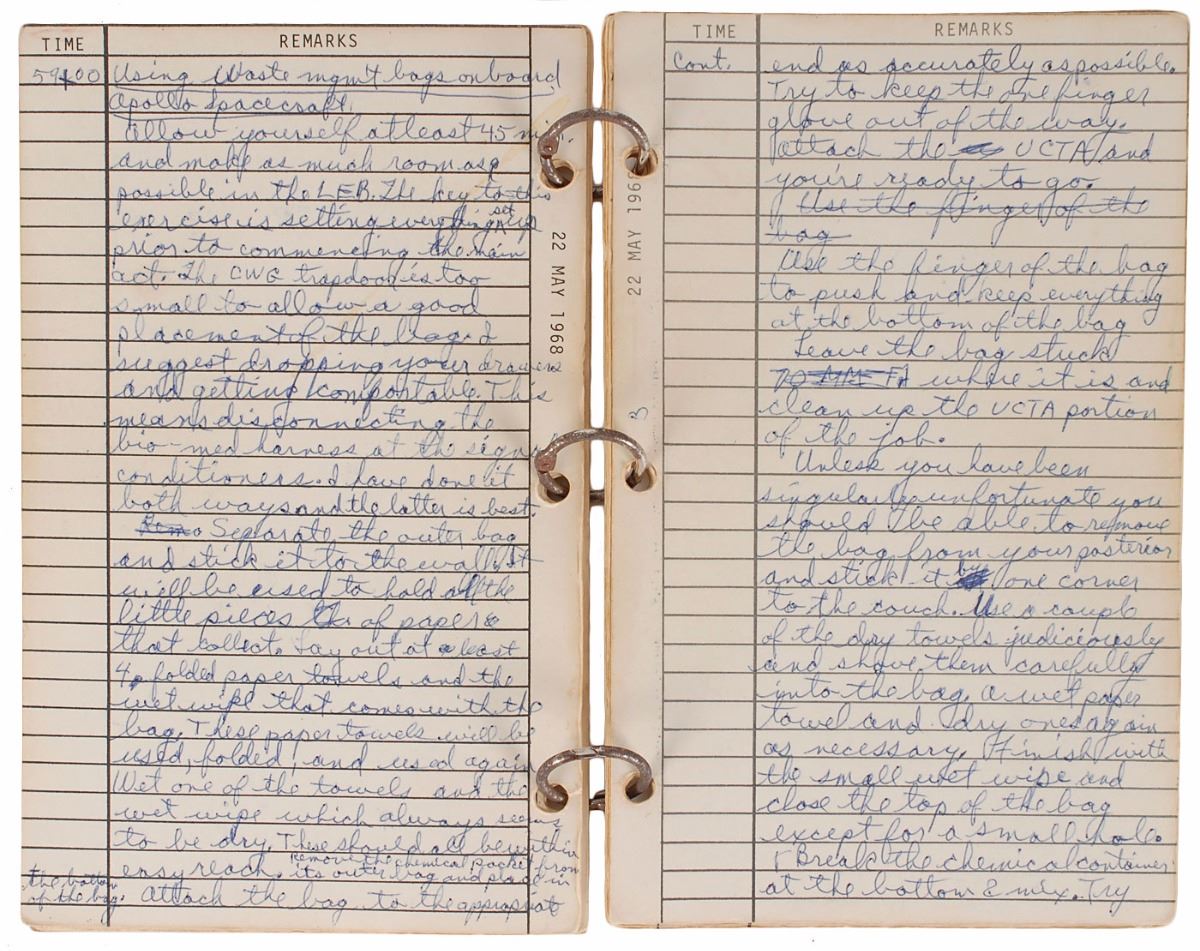 The two opening pages feature Cunningham’s extensive instructions for future astronauts, headed “Using waste mgm’t bags on board Apollo spacecraft,” which he later published in his book The All-American Boys, in part: “I suggest dropping your drawers and getting comfortable.”