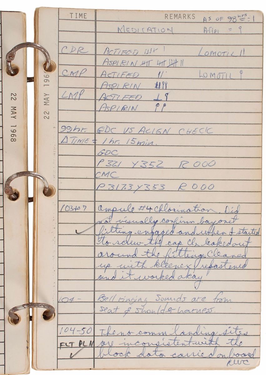 The very first handwritten page consists of their “B.M. Log,” where Cunningham has recorded the times of each crew members’ bowel movements. The last entry, however, is made by the boastful Eisele, who adds a censored joke, “CMP is #1 on the __ list—(Wally is a poor t(h)ird).” In other health matters, later in the log is a record of medication taken by the crew in the hand of Schirra, who had developed a severe head cold and frequently took aspirin.