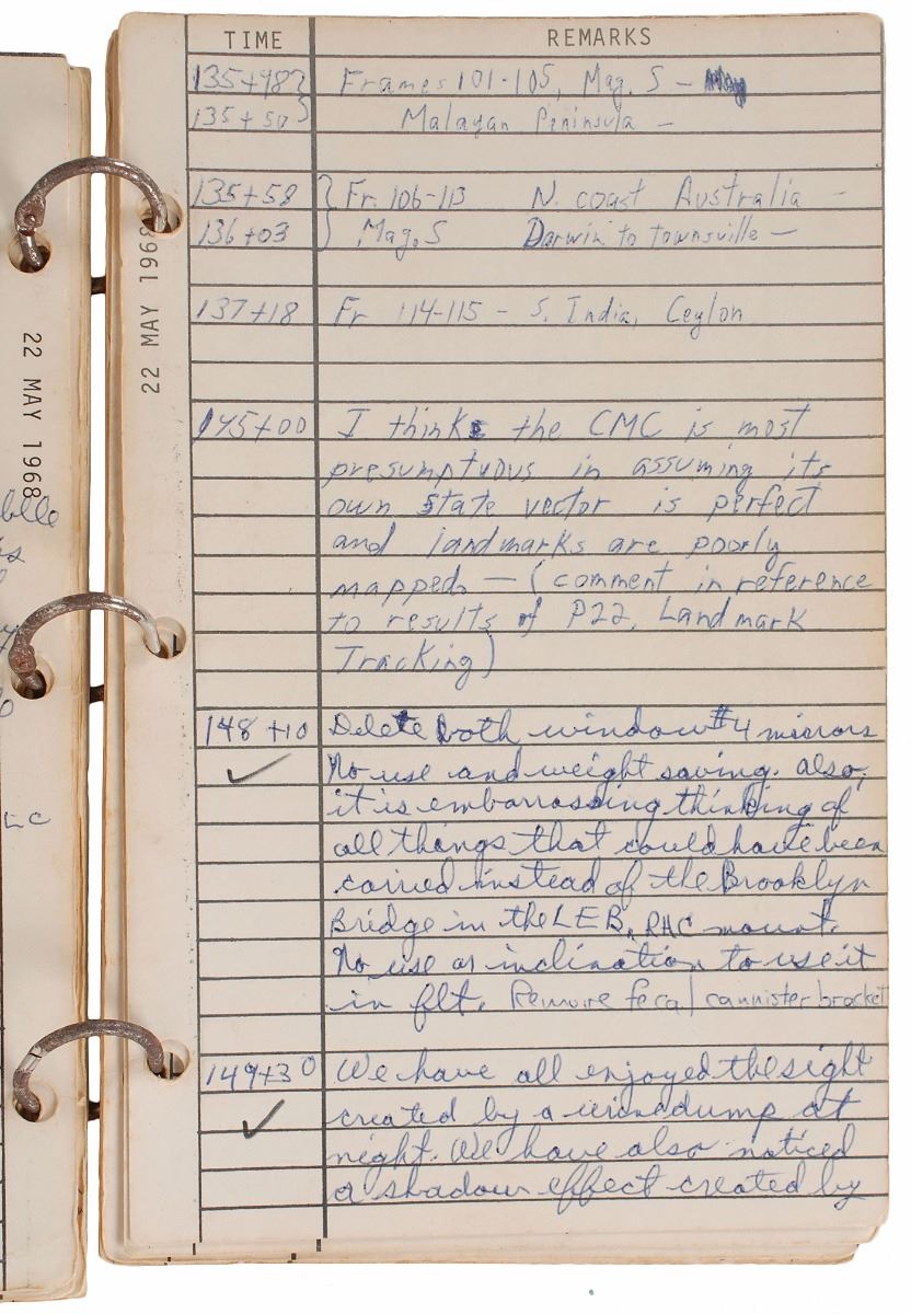The entries also reveal a growing dissatisfaction with Mission Control and some of the mission planning. At 145:00, Eisele writes, “I think the CMC is most presumptuous in assuming its own state vector is perfect and landmarks are poorly mapped." Cunningham then suggests some modifications to the spacecraft, “Delete both window #4 mirrors, no use and weight saving. Also, it is embarrassing thinking of all the things that could have been carried instead of the Brooklyn Bridge in the LEB.” At 241:18, Schirra notes, “Crew discipline—In role of starting a task then to completion difficult—GRND distracts and crew themselves tend to—from menial to critical.” He also writes, “4 to 5 lbs of fuel for the last day photos yet—40 to 50 lbs for stupidity."