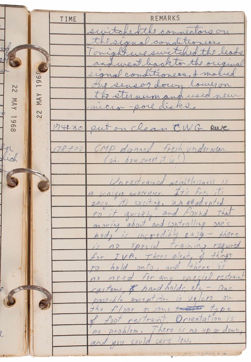 Extraordinary crew log book extensively used throughout the Apollo 7 flight, 32 pages (16 double-sided sheets) plus cardstock covers, 5 x 8, signed and flight-certified on the rear cover in black ink, “Flown on Apollo 7—Walt Cunningham, Apollo 7.” The log book is extensively filled out with in-flight notes, remarks, and observations by all three astronauts on 23 of the 32 pages. Their entries are logged using the Ground Elapsed Time, and cover a wide range of content, including scientific observations, practical recommendations about the spacecraft and flight procedures, objective health observations, and humorous remarks.