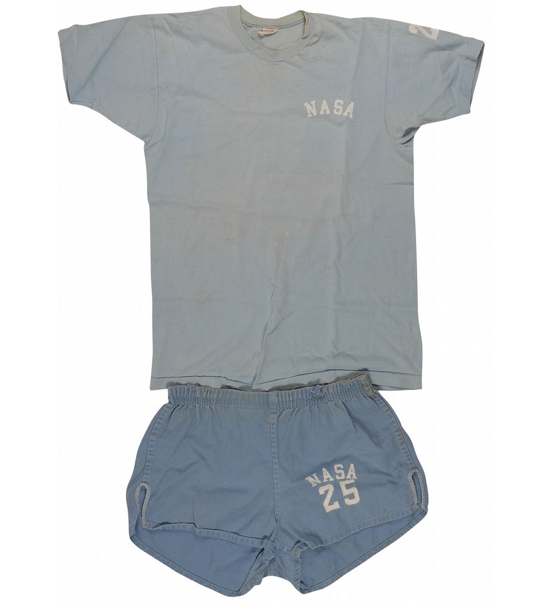 Eisele’s flown and worn NASA shorts and T-shirt, worn during the Apollo 7 mission. Light blue Champion gym shorts, with “NASA 25,” printed on the left thigh and matching light blue Champion short sleeve T-shirt, with “NASA” printed on the left breast. Accompanied by a letter of authenticity from Eisele’s wife Susan Black stating “I do attest that this is a NASA gym shirt and pair of shorts that were worn in space by Donn during the Apollo VII mission.” Some scattered light staining and soiling to both, otherwise fine condition.