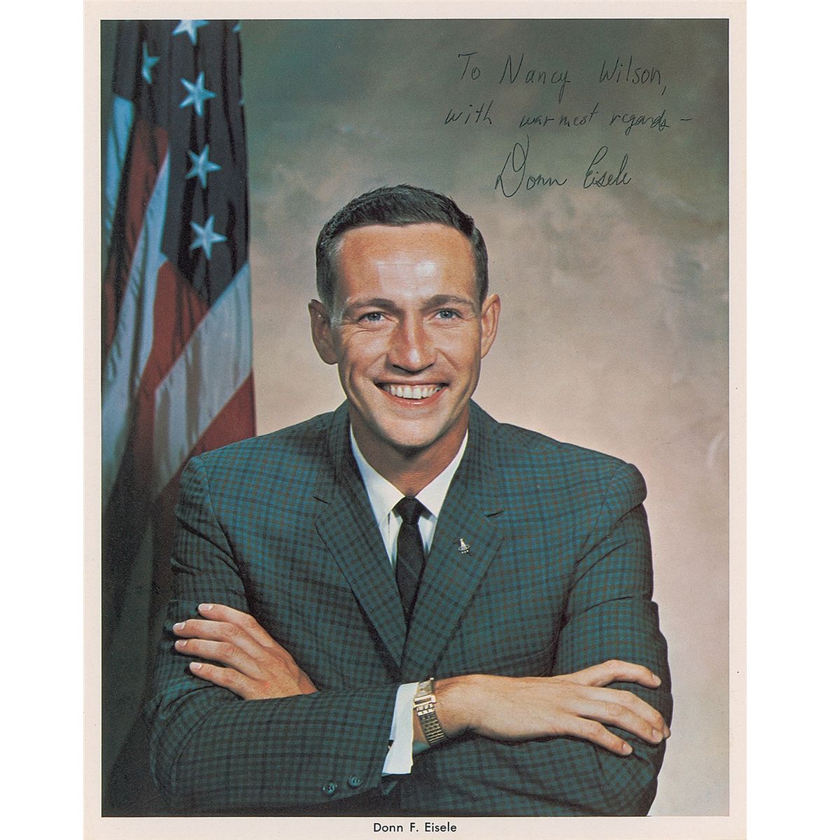 Color vintage 8 x 10 NASA photo of Eisele in a plaid suit, signed and inscribed in black felt tip, “To Nancy Wilson, with warmest regards—Donn Eisele.” In fine condition, with a trivial crease to the lower left corner tip.