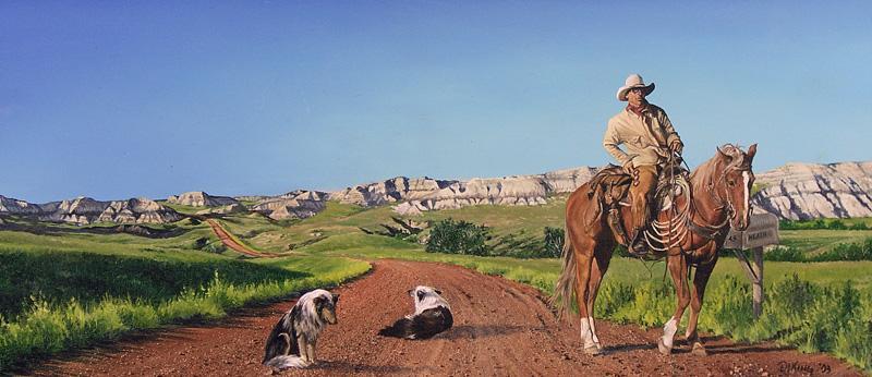 Canadian [20th/21st century] WAITIN' FOR THE MAIL; 2003 oil on board 8 x 18 in. (20.3 x 45.7 cm) signed, titled & dated