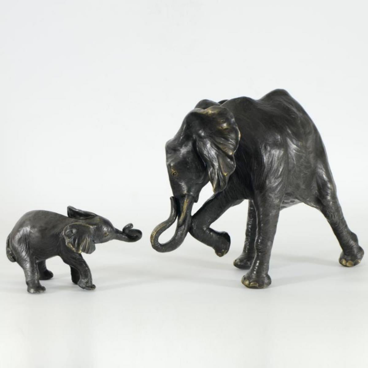 "Mother and Child" is a limited edition bronze two piece sculpture set, numbered and signed by Donna Mason-Adams. Includes Certificate of Authenticity. Large elephant measures approx. 13" (width) x 5" (depth) x 11" (height), 16 lbs. (weight). Small elephant measures approx. 9" (width) x 3" (depth) x 5" (height), 3 lbs. There may be some small areas with a slight white coloring due to oxidation, which commonly occurs with bronze pieces. This is normal and superficial. The inner layers of the object are protected from deterioration. Reference #: 236393.