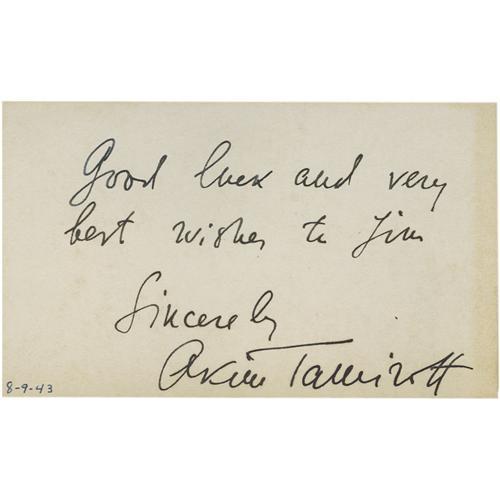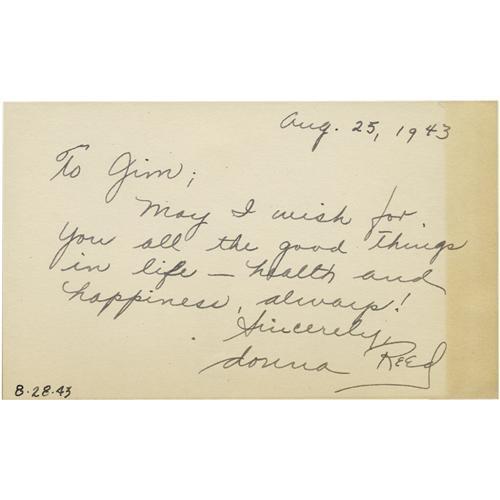 <B>Donna Reed/Akim Tamiroff Autographs.</B></I> A 3" x 5" notecard inscribed and signed by Donna Reed in black ink, mounted on an album page beneath a magazine photo of her. On the reverse is a similar card inscribed and signed by Akim Tamiroff in black ink, mounted below a newsprint photo of him. In overall Very Fine condition with some tanning along the edges of the notecards.<BR><BR><b>Shipping:</b> Flat Material, Small (<a target="_blank" href="http://www.heritageauctions.com/common/shipping.php">view shipping information</a>)
