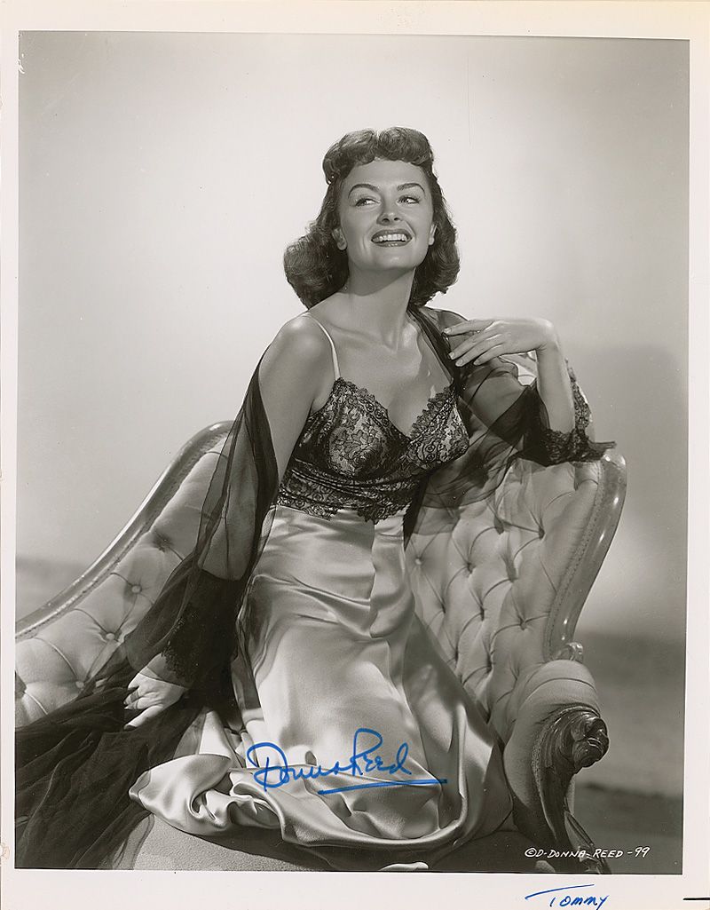 Lovely glossy 8 x 10 photo of Reed in a fancy chair, signed in blue felt tip. In very good to fine condition, with a few creases and impressions, three binder dings to left edge, light toning to top border, and a pen notation to the lower border.