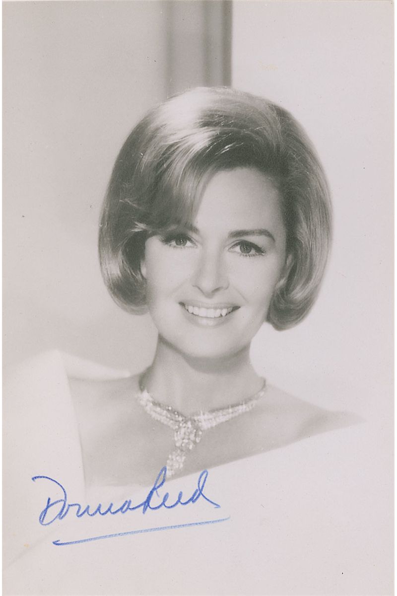 Matte-finish 4 x 6 photo of Reed wearing a dazzling necklace, signed in blue felt tip. In fine condition.