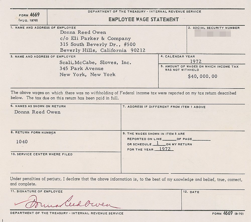 DS, signed “Donna Reed Owen,” one page, 8 x 7, 1972. IRS form 4669 employee wage statement for Reed’s income. Reed claims $40,000 “on which income was not withheld,” and signs at the bottom of the page. In fine condition, with a central horizontal fold and show-through from a label affixed to reverse.