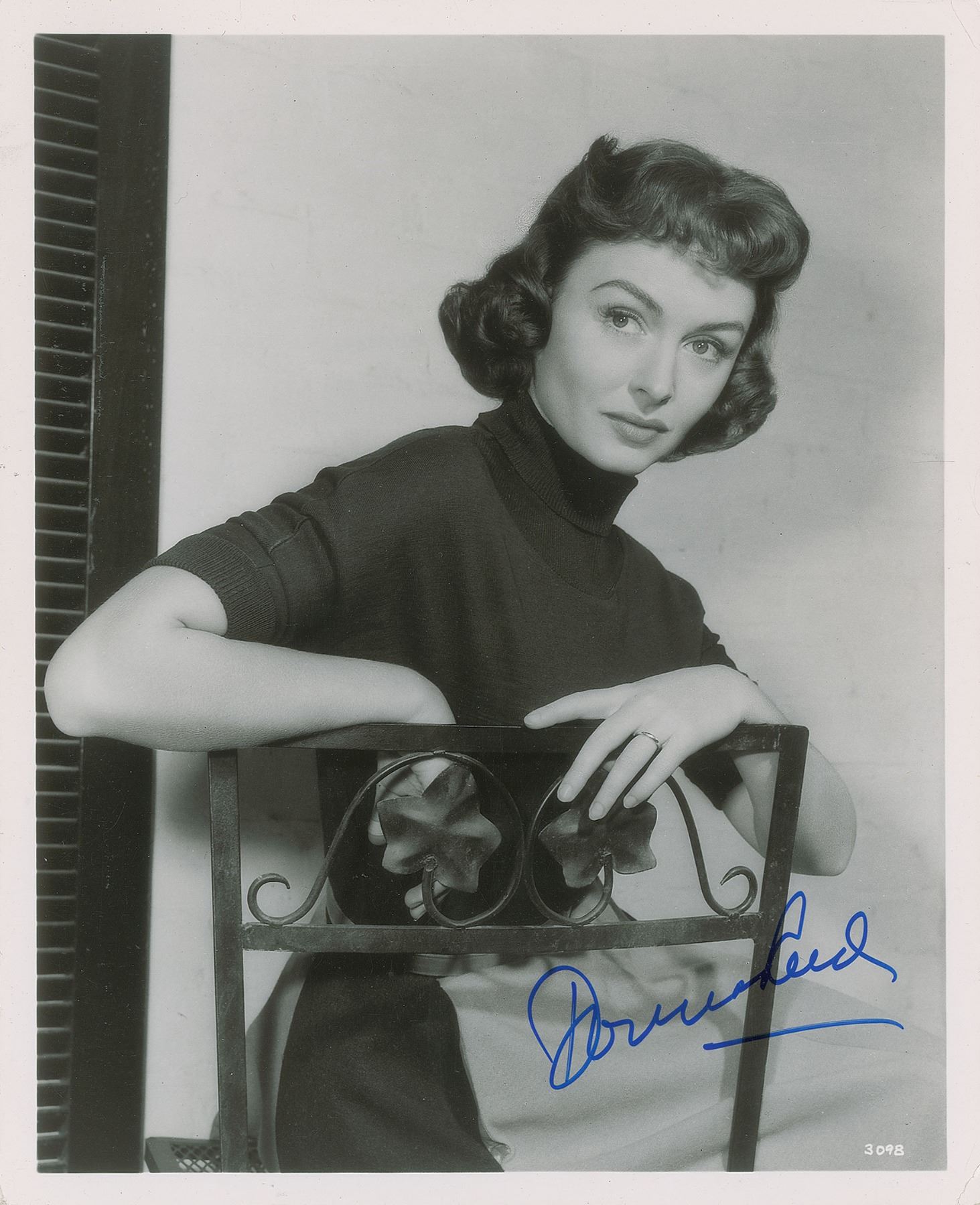 Glossy 8 x 10 double-weight photo of Donna Reed in an attractive seated pose, signed in blue felt tip. Reverse bears an MGM stamp for the 1956 film Ransom! In fine condition.