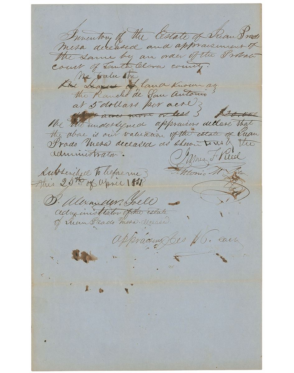 Businessman and soldier (1800–1874) best remembered as an organizing member of the ill-fated 1846 Donner Party emigration to California. Manuscript DS, signed “James F. Reed,” one page, 7.75 x 12.25, April 25, 1851. Reed certifies an official document concerning an estate in California. In part: “Inventory of the Estate of Juan Prado Mesa deceased and appraisement of the same by an order of the Probate Court of Santa Clara county. We value the land known as the Rancho de San Antonio at 5 dollars per acre.” Signed at the conclusion by Reed and countersigned by two other court officials. In fine condition, with expected document wear and several stray ink marks and brushes (none affecting the signature).