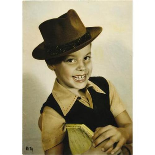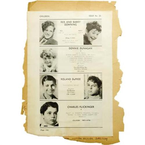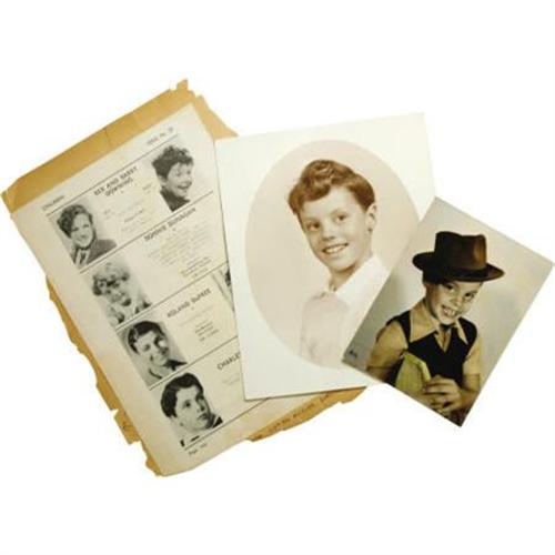 <B>Donnie Dunagan "Bambi" Production Photos.</B></I> Two exceptionally rare photos of Donnie Dunagan taken at the time of Walt Disney's <I>Bambi</B></I> (1942), for which Donnie provided the voice of Bambi the fawn. They include a 5" x 7" shot of Donnie smiling and sporting a hat, and an 8" x 10" portrait with an appealing oval -frame effect. The verso of the 8" x 10" shot has hand-written information regarding Donnie's address, vital statistics, etc., added when Donnie was 12 (he was five at the time of <I>Bambi</B></I>), and the stamp of the "Broadway-Hollywood" photographer. There is also a page from the <I>Motion Picture Directory,</B></I> circa 1940, with pictures and credits for various child actors, including Donnie. The page from the directory (which was published about the time of the production of <I>Bambi</B></I>) is glued to a scrapbook age, and the verso features a telegram to Donnie and a birthday party invitation. Ultra-rare, desirable items dynamically related to an all-time Disney classic! <I>From the Donnie Dunagan Archive</B></I>.<BR><BR><b>Shipping:</b> Flat Material, Small (<a target="_blank" href="http://www.heritageauctions.com/common/shipping.php">view shipping information</a>)