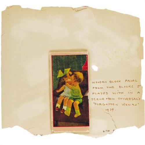 <B>Donnie Dunagan's Wooden Block Panel and Christmas Tags from His Scrapbook.</B></I> An unusual lot: a scrapbook page that features a color panel from a wooden toy block that Donnie Dunagan played with in Universal's <I>The Forgotten Woman,</B></I> a 1939 tear-jerker starring Sigrid Gurie; and on the reverse are six colorful Christmas tags from gifts given to Donnie at Yuletide circa 1939. The approximately 3" x 5.5" block panel features a charming picture of a little boy kissing a wide-eyed and surprised little girl, and Donnie has printed on the page beside it, "wooden block panel from the blocks I played with in a scene from Universal's 'Forgotten Woman' 1939." The Christmas tags feature Santa, a snowman, bells, and other Yuletide markings. The 9" x 10" page has tears but the tags are intact and the block looks as if a Universal prop man has just painted it. Charming curios in overall Very Fine condition. <I>From the Donnie Dunagan Archive</B></I>.<BR><BR><b>Shipping:</b> Flat Material, Small (<a target="_blank" href="http://www.heritageauctions.com/common/shipping.php">view shipping information</a>)