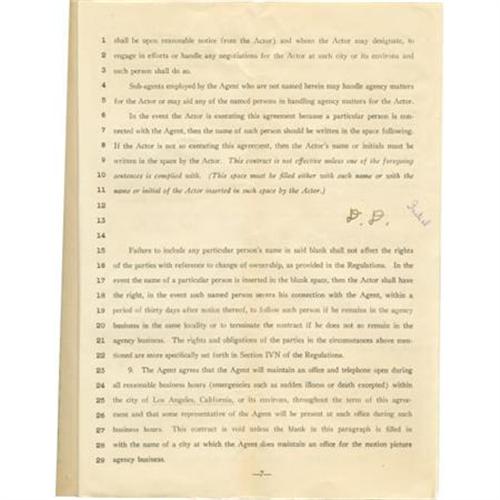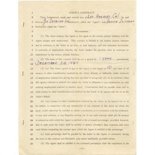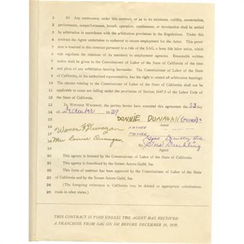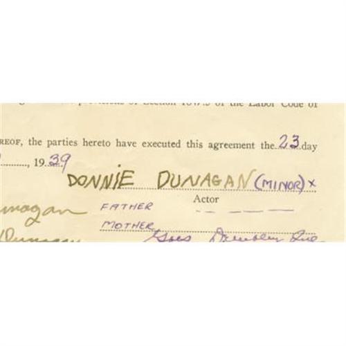 <B>Donnie Dunagan Signed Contract.</B></I> Eight-page, 8.5" x 11" Agency Contract, dated December 23, 1939, signed by Donnie Dunagan, his parents and agent Gus Dembling, in which Dunagan signs with Dembling's agency for one year. Dunagan has also initialed page seven. The very detailed contract gives insight into the workings of a Hollywood agency of that era, and has historic impact, as it led to Dunagan's engagement as the voice of the fawn in Disney's <I>Bambi.</B></I> Excellent condition. <I>From the Donnie Dunagan Archive.</B></I><BR><BR><b>Shipping:</b> Flat Material, Small (<a target="_blank" href="http://www.heritageauctions.com/common/shipping.php">view shipping information</a>)