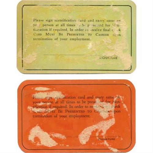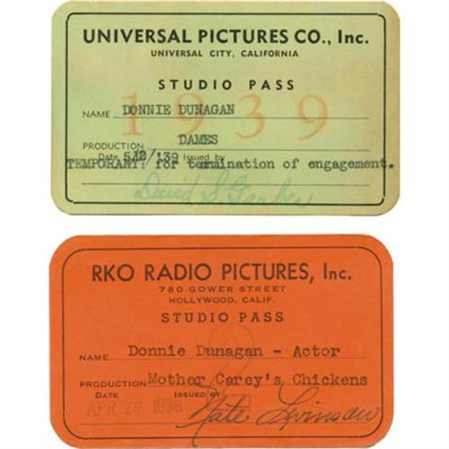 <B>Donnie Dunagan's ID Cards from RKO and Universal Studios.</B></I> Ultra-rare items indeed: These were Donnie Dunagan's studio passes -- an orange-colored pass to RKO Radio Pictures, stamp-dated April 27, 1938 and issued for use during the production of <I>Mother Carey's Chickens,</B></I> and a light green pass to Universal Pictures Co., with typed date 5/12/39 and issued for use during the shooting of <I>Dames</B></I> (the title later changed to <I>The Forgotten Woman</B></I>). Dunagan's name and the film's title are typed on the cards, with the RKO card signed by Nate Levinson and the Universal card by David S. Garber. Each card has a notification on the reverse that it must be presented to the studio cashier at the time employment is terminated. There is residue on the reverse of each card from having been preserved in Dunagan's scrapbook; the front of each card is in Excellent condition. Mind-boggling to think that child actor Dunagan took these cards to work at the studio every day and that they've survived almost seven decades. <I>From the Donnie Dunagan Archive</B></I>.<BR><BR><b>Shipping:</b> Flat Material, Small (<a target="_blank" href="http://www.heritageauctions.com/common/shipping.php">view shipping information</a>)