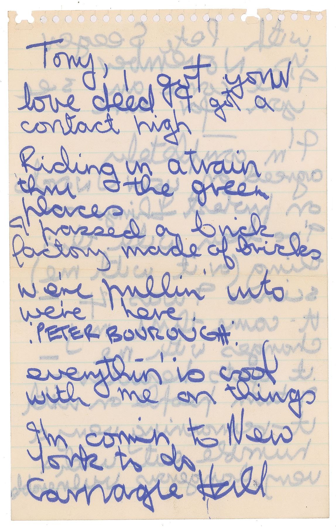 ALS signed "Don," three pages both sides, postmarked at London, August 20, 1965. Letter to Tony Glover, in part: "I got your love deed I got a contact high. Riding in a train thru the green places I passed a brick factory made of bricks. We're pullin into we're here: Peterborough. Everythin' is so cool with me on things. I'm comin to New York to do Carnegie Hall with Pete Seeger in November. I'll come an' see you for sure. I'm completely agreed on your words on protest things—I've been with this thing (or it with me) since I was 14—it came thru my changes with me—it gets heavier—I turn people on with it remaining very a humble cat with a very dangerous vulnerable amount of love. I've talked to many of the sunshine people. Some ride the rocking horse (too many) I've seen them settle in fucked up bitter scenes. 'They say that love is like a child upon a rocking horse of polka dot, the color black, that rides thru a forest of dreams an' laughs at the evils that cannot be seen.' (Harvest your thoughts of love) Bert Jansch. Derroll Adams held me with everything he could grip me with. I held him with strange old hands whilst we waited for blood in his puke. He loves so much his eyes are scars. I've seen him run like a kid in a cowboy hat thru rained on grass his scotch bottle not long scored glinting, a highly polished chain." In fine condition. Accompanied by the original mailing envelope.