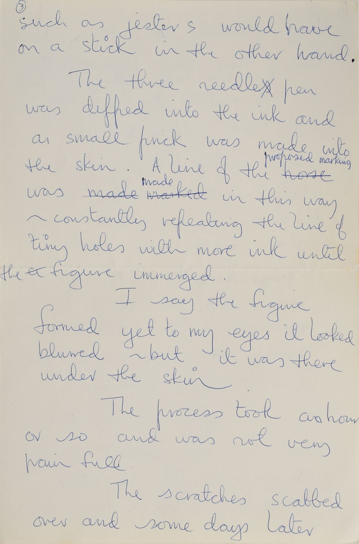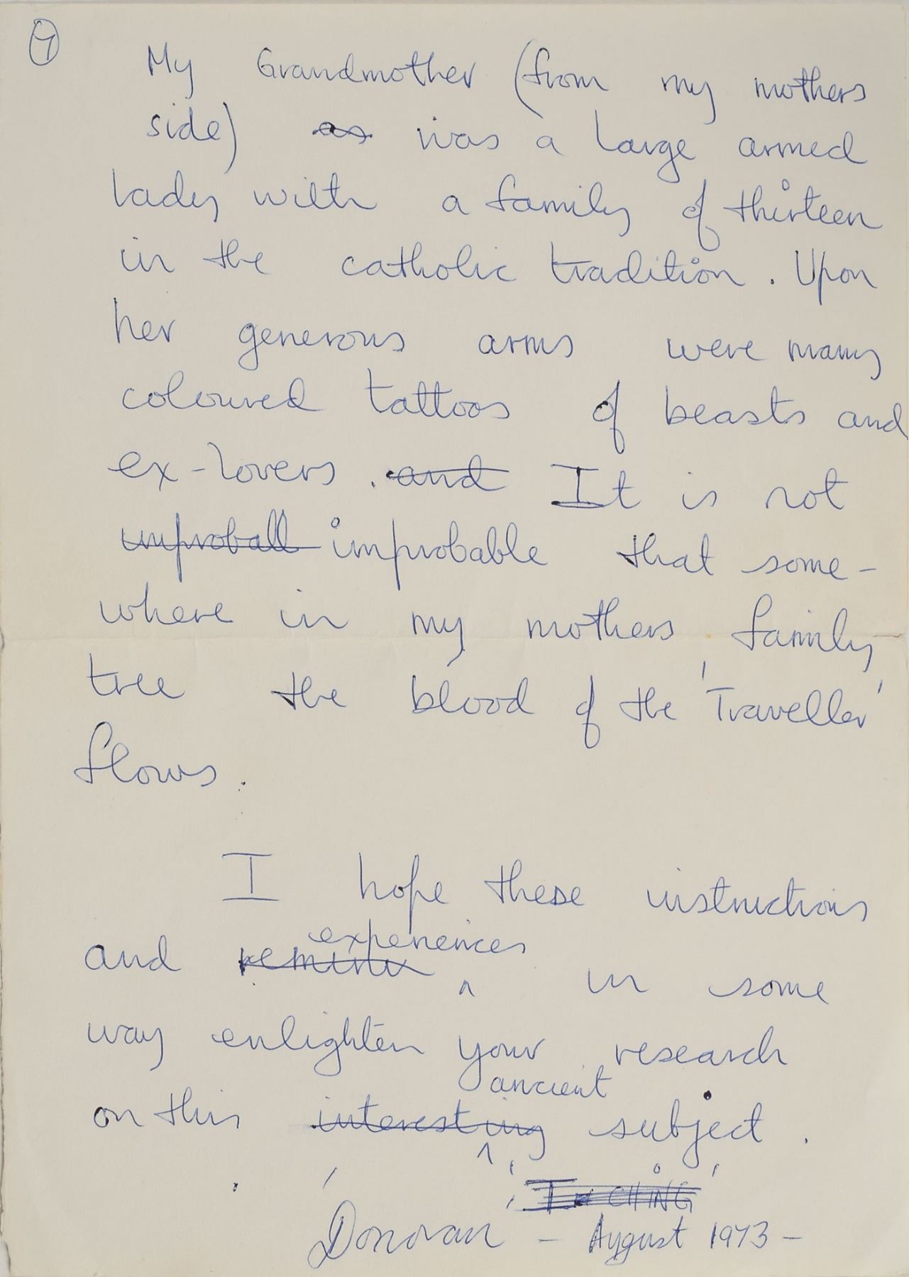 ALS, seven pages, 8.25 x 11.5, August 1973. Expansive letter to a fan, in part: "I travelled the road when I was younger in the early sixties regarding myself a Beatnik and enjoying the company of the ragged folk—sleeping rough and clean under the stars. I met with ex-seamen and ex-prisoners both tattooed, some in the primitive style and some in the more sophisticated electric style. My tattoo was made primitive style. Three needles bound together with cotton and a bottle of permanent ink…The primitive style of marking is, I am told practised behind bars to pass the heavy time. Mick Taylor was a fine–line artist on paper so he designed the head of a horse with bells on cords such as jesters would have on a stick in the other hand…I say the figure formed yet to my eyes it looked blurred—but it was there under the skin. The process took an hour or so and was not very pain full. The scratches scabbed over and some days later they peeled to reveal a tiny fine-line blue-tattoo of a horse's head with jesters bells at the elbow joint of my right arm. Very nice…The girls in the scene went in for flower symbols on the heel, hip, or other delicate positions. Very sexy…My tattoo has blurred over the years yet the form of the fine horsey nostril and plaited mane of the fab beast remains. There is obviously art-magic attatched [sic] to symbols marked upon the body—I exclude the dotted line around the wrist with the words—'cut here'—a 'deppression' [sic] tattoo from behind the walls of the evil prisons of man. My Grandmother (from my mother's side) was a large armed lady with a family of thirteen in the Catholic tradition. Upon her generous arms were many coloured tattoos of beasts and ex-lovers. It is not improbable that somewhere in my mother's family tree the blood of the 'Traveller' flows." In fine condition. Accompanied by a letter of provenance from the original recipient, in part: "In the early 1970's I was researching tattooing. It was a far different scene back then, I focused on sailors, bikers, whores and prisoners. I was a fan of Donovan's music, and he issued a 2 album set called 'A Gift From A Flower To A Garden.' It included a poster with an image of him that revealed a jester's horse on his elbow. To enhance my research, and because I was such a fan, I contacted Donovan through a friend in the music business and asked him to share his thoughts on his tattoo and tattooing with me. The enclosed piece of writing is the result."