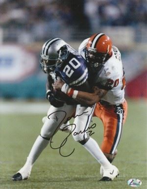 Donovin Darius played at Syracuse University, setting the team record for tackles by a defensive back with 379. He had a well deserved reputation as one of the dirtiest hitters in college football. He was a Big East All-Conference player in 1995 and 1996. Donovin Darius has hand autographed this Syracuse Orangemen 8x10 Color Photo. FI Hologram and Certificate of Authenticity from Athlon Sports.