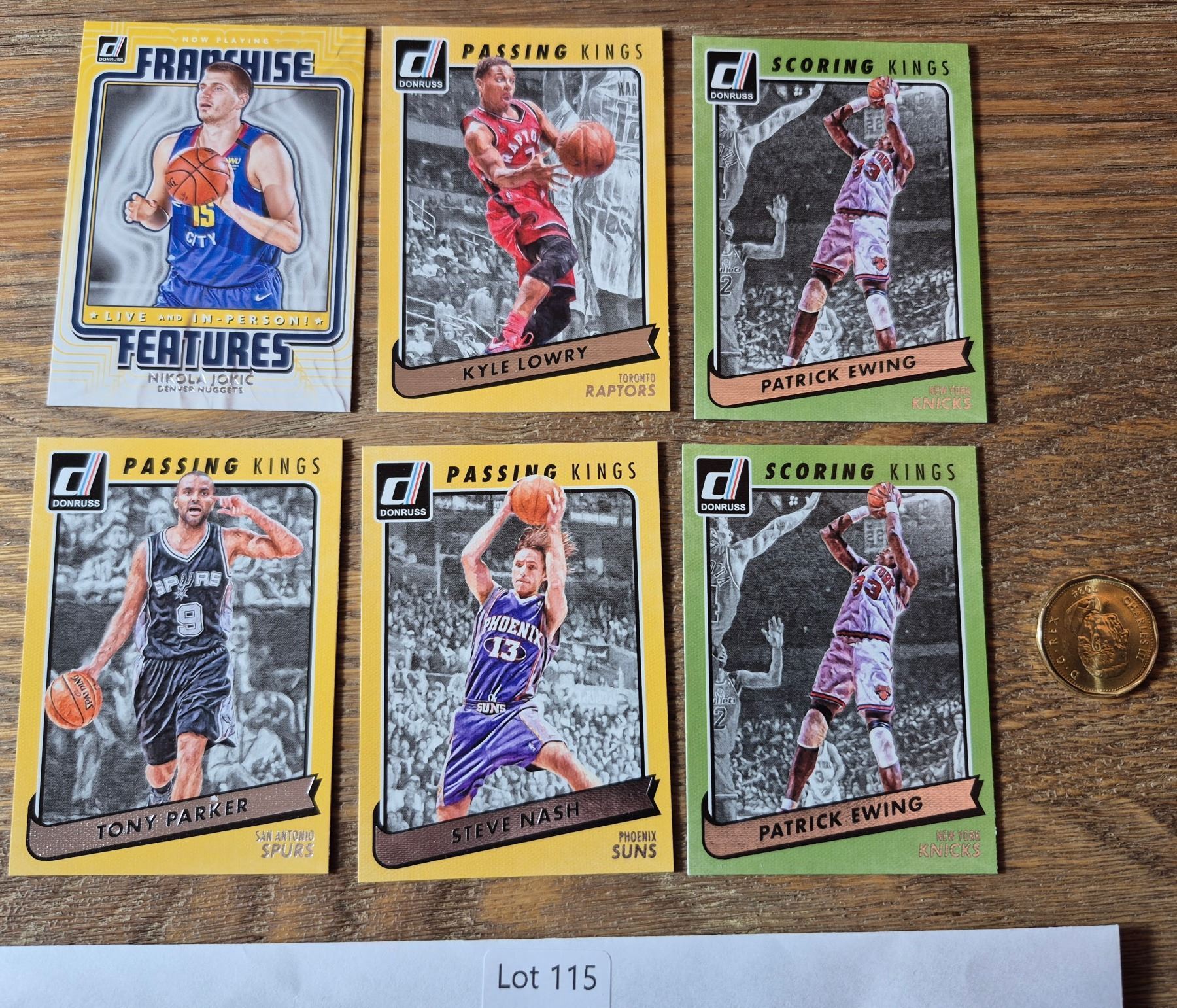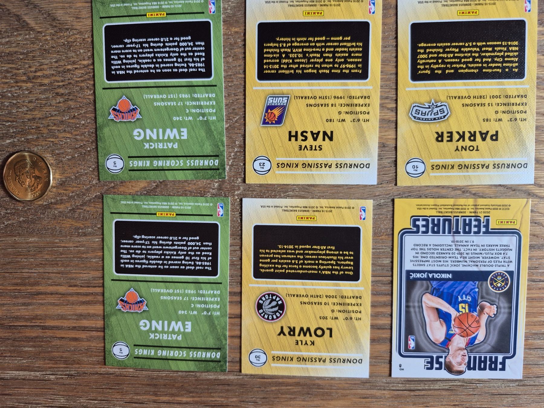 Six-card insert mix featuring Passing Kings (Parker, Lowry, Nash) and Scoring Kings (Ewing ×2) with one Now Playing “Franchise Features” card.