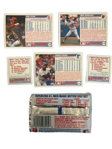 1 OPEN pack of 1988 Sportflics Magic Motion Baseball cards, featuring 3 Superstar cards and 2 Magic Motion Trivia cards: Mike Boddicker - Orioles, John Tudor - STL, Harold Baines - White Sox
