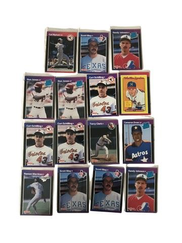 This collection of 15 Donruss baseball cards offers a mix of established stars, rising prospects, and a Hall of Famer. Anchored by the "Iron Man" himself, Cal Ripken Jr., the set also boasts two cards each of pitching ace Randy Johnson, and three cards each of Curt Schilling and Scott May. Ramon Martinez and Terry Clark represent other talented arms, while Cameron Drew and Ron Jones add to the collection's variety. Highlighting the group is a Hall of Fame Diamond King card of the legendary Warren Spahn, adding a touch of history to this interesting assortment of baseball cards.