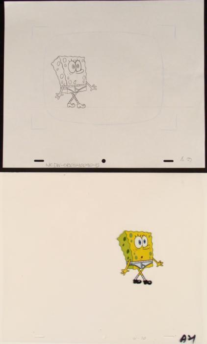 This original animation cel and drawing are from the Nickelodeon TV show SpongeBob Squarepants. The story takes place under the deep blue sea in Bikini Bottom, where SpongeBob resides. SpongeBob, who is a yellow, porous sponge, is your typical happy-go-lucky character, as he is always cheerful and enjoys making people laugh. Patrick Star, SpongeBob's neighbor who is a starfish, is your average children's show idiot, as he boasts knowing nothing and is often getting himself into ridiculous situations. Between the homes of these two lies the home of the miserable Squidward, a squid, who is known for being grouchy and playing tricks on SpongeBob and Patrick. Both SpongeBob and Squidward work at the Krusty Krab, a fast food business run by the greedy money-loving Mr. Krabs, a crab, the arch rival of the evil, possibly misunderstood, Plankton. Another neighbor, Sandy Cheeks, an athletic squirrel who normally wears an astronaut's space suit, was introduced in "Tea at the Treedome." She spends most of her time inventing and experimenting. The cel comes with a matching drawing overlay. Don't take another step Spongebob...Original Production Animated Cel and Drawing Original "rough" animation drawing, in black with notations in black. Overall Size of Drawing: 10 1/2" x 12 1/2" Overall Size of Cel: 10 1/2" x 12 1/2" Excellent ConditionThis is an original hand-painted cel set-up used in the production of an episode of "SpongeBob SquarePants." Each one-of-a-kind set-up represents a slight change in position of the characters. When individually photographed and projected in rapid succession, the images appear to move.