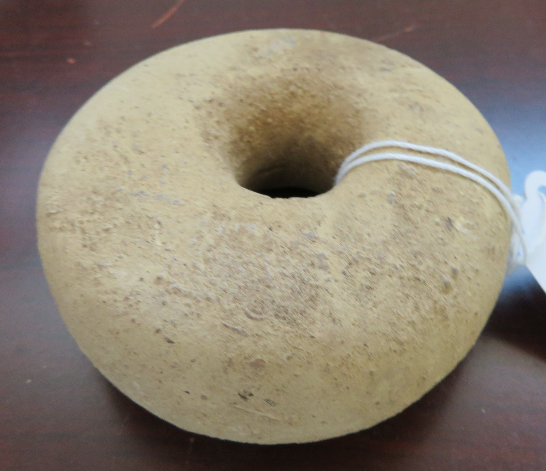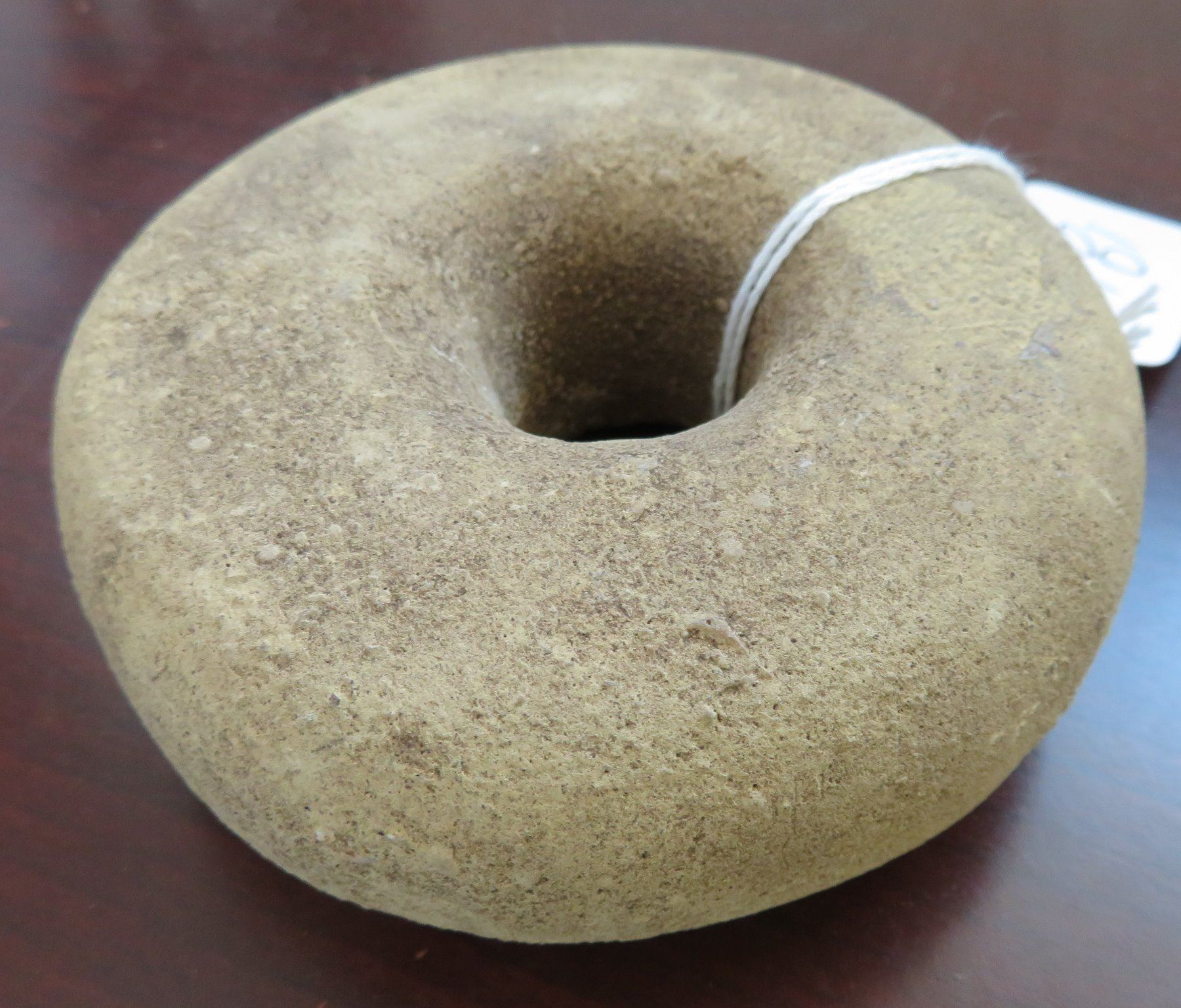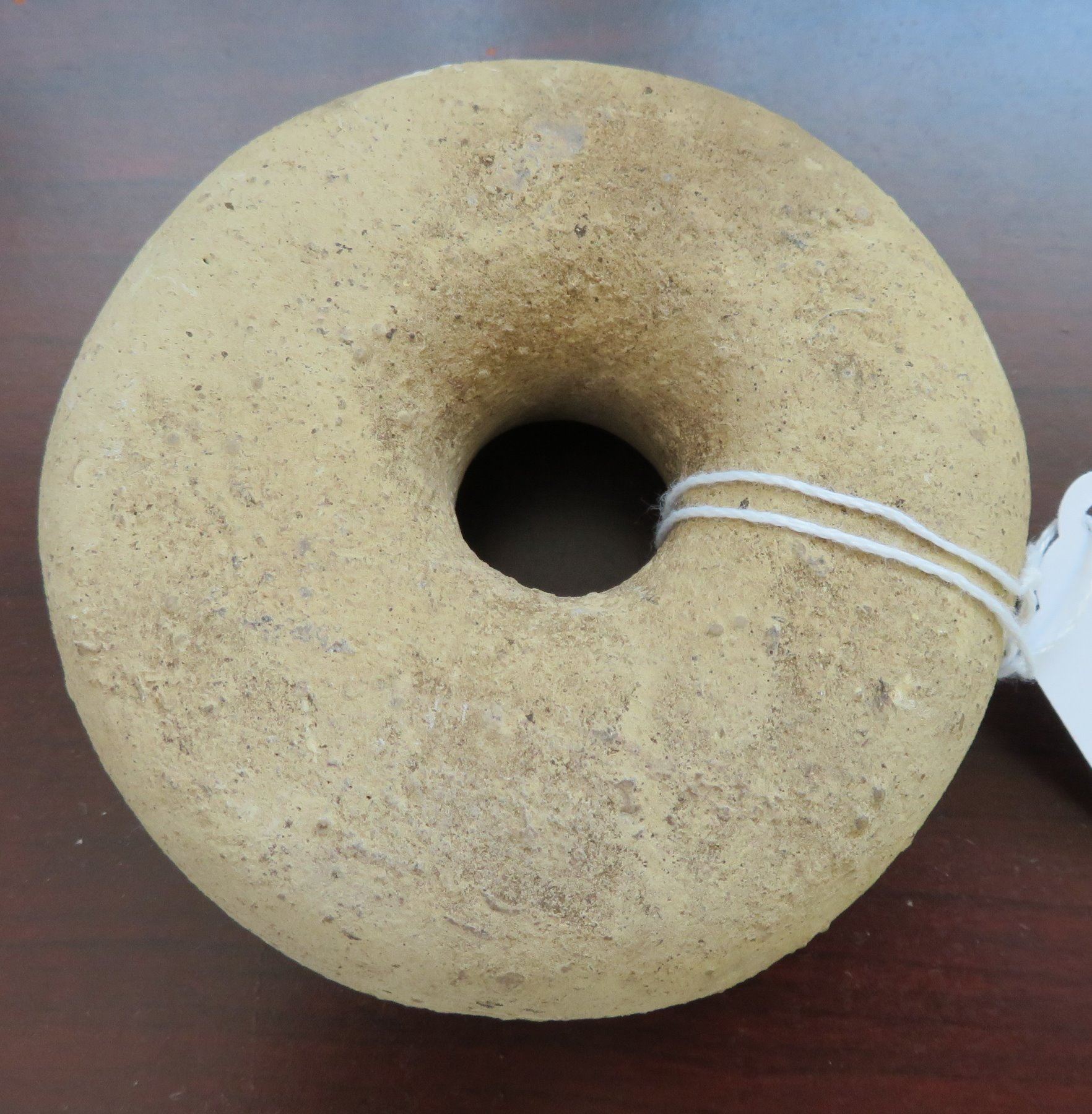 Donut Stone-Mace Head, pre-historic item. Made of sandstone, the item measures 3 1/2" x 1 1/2". Santa Barbara County, California. Condition: Good, nice patina, see images. Shipping: $22.00 w/insurance and signature, due to value.