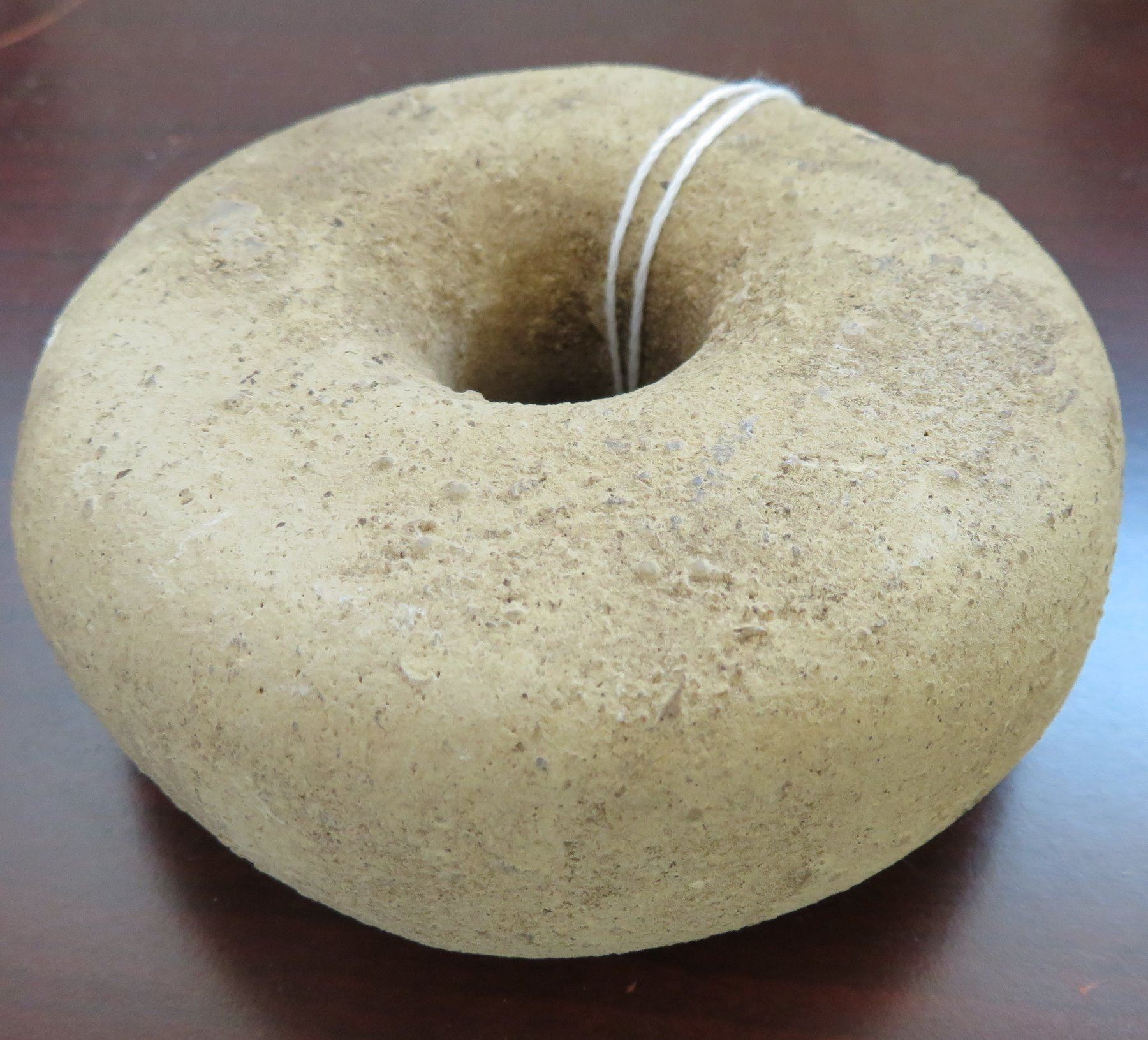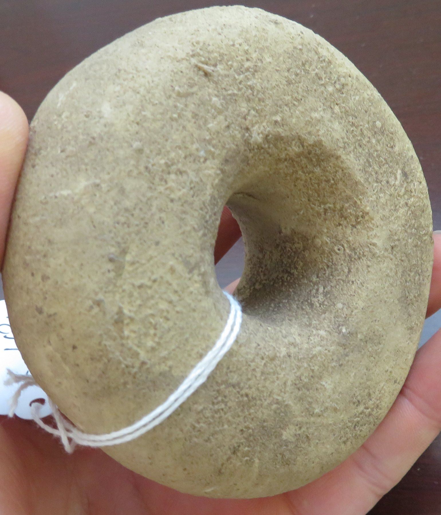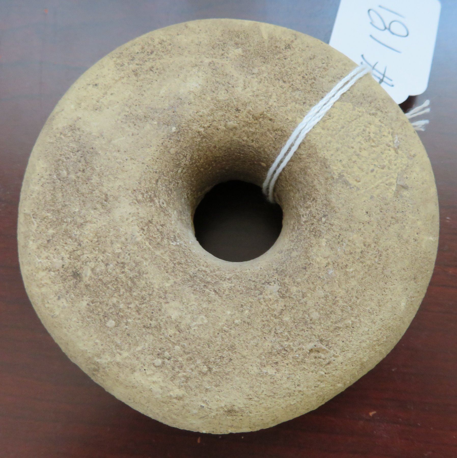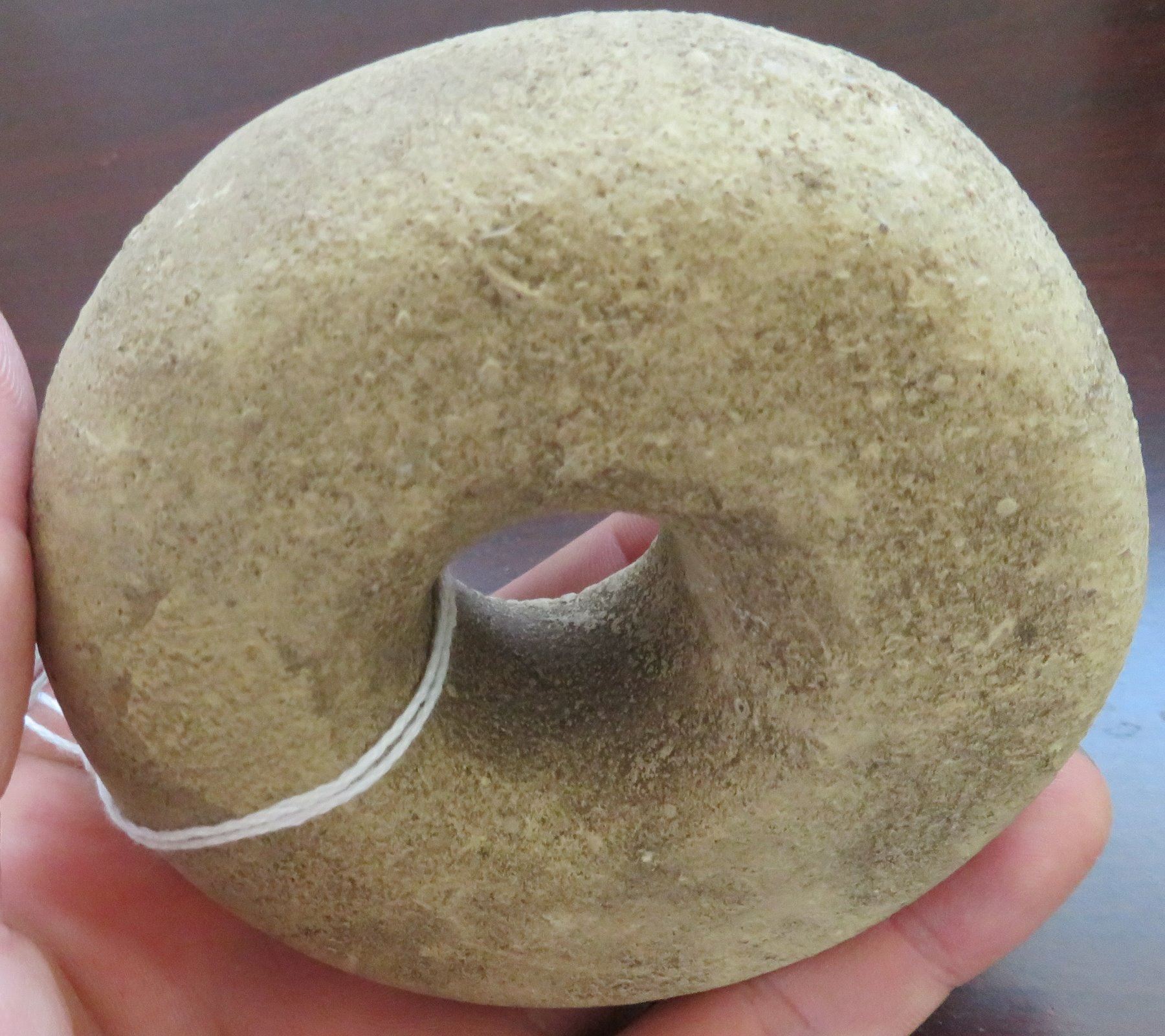 Donut Stone-Mace Head, pre-historic item. Made of sandstone, the item measures 3 1/2" x 1 1/2". Santa Barbara County, California. Condition: Good, nice patina, see images. Shipping: $22.00 w/insurance and signature, due to value.