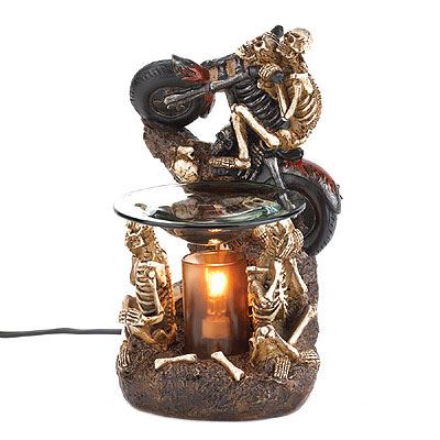 Doob Rider Oil Warmer **|**|** Get your motor running with this rollicking oil warmer. A grinning skeleton rides his flame-covered chopper motorcycle through fire and brimstone as two seated skeletons see and speak no evil. Add your favorite scented oil to the clear glass basin to fill your room with spirited aroma. Item weight: 2 lbs. 5-1/2 x 6" x 9" high. Polyresin and glass dish. 1 EA"