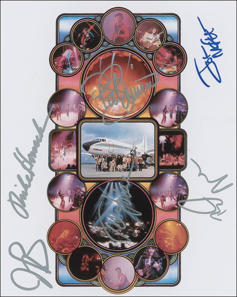 Color satin-finish 8 x 10 composite photo of the Doobie Brothers on tour, signed in silver ink and blue felt tip by Jeff 'Skunk' Baxter, Tom Johnston, Pat Simmons, Michael Hossack, John McFee, and Bill Payne. In fine condition, with some light contrast to Tom Johnston and Pat Simmons’ signatures.