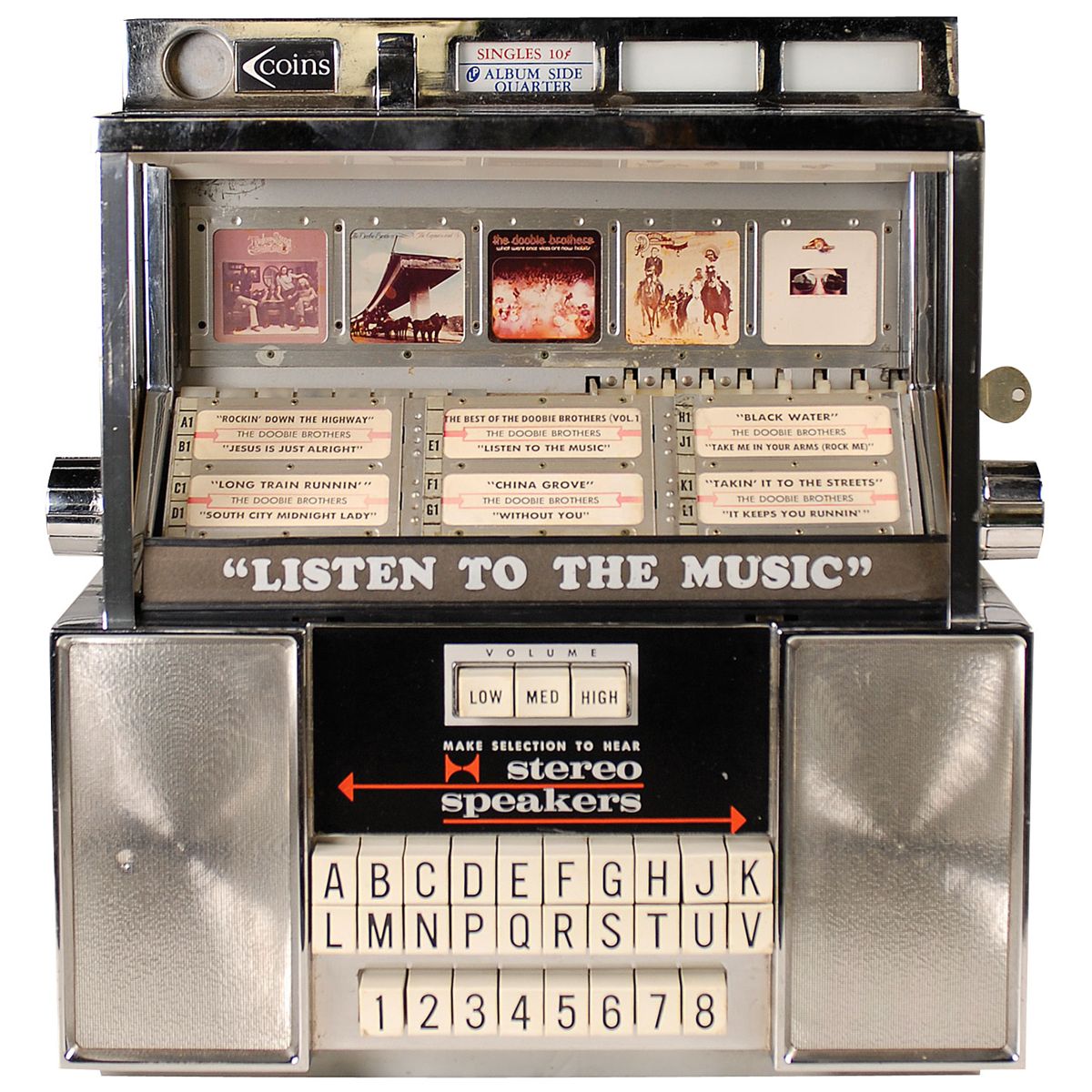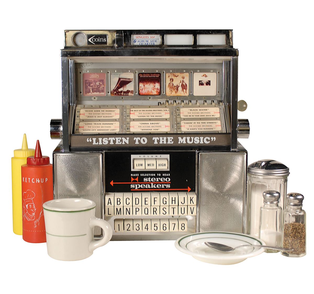 A remarkable survivor of the 1970s is this original Seeburg table-top jukebox that is depicted on the cover of the multi-platinum album, Best of the Doobies. Since its original release in 1976, the album has racked up sales of 10 million copies in the US alone. Jukebox measures 13.25 x 16.5 x 6, and weighs 34.5 pounds. Also included are the prop plastic ketchup and mustard squeeze bottles, coffee cup, saucer, spoon, salt and pepper shakers (with salt and pepper still inside), and partially full sugar dispenser. In fine overall condition, with no front glass to jukebox. Accompanied by a certificate of authenticity from the San Francisco Art Exchange.