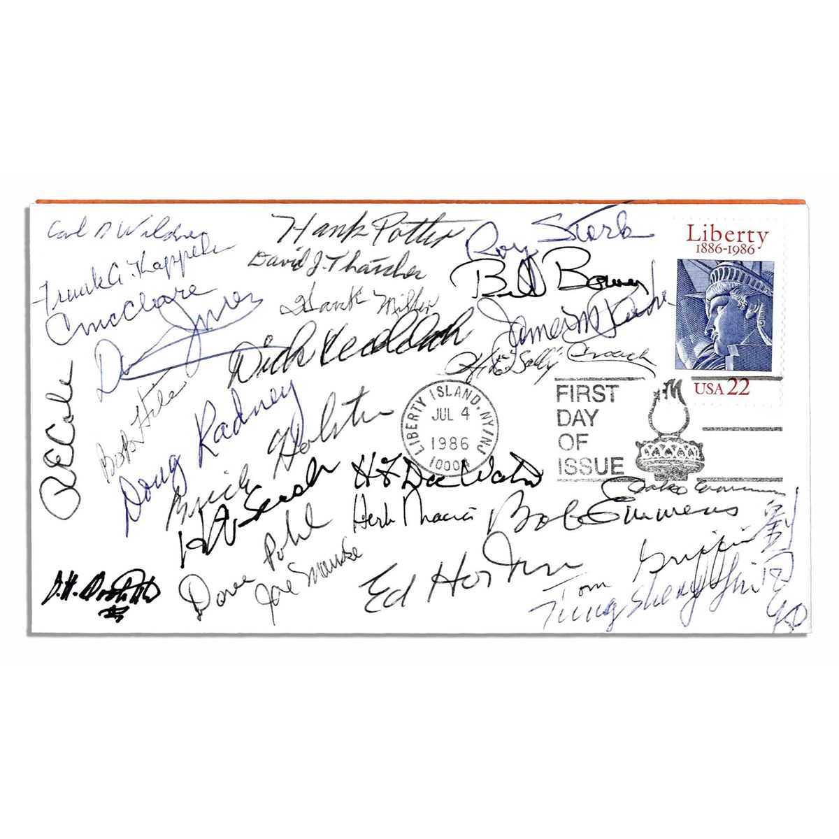 Fantastic first day cover for Liberty Island signed by 27 Doolittle Raiders including General Doolittle who signs ''J.H. Doolittle''. Cover dated 4 July 1986 is signed by 26 others including pilots David Jones, Harold Watson and Bill Bower. Also: Bob Emmens, David Thatcher, Charles McClure, Hank Potter, Ed Horton, Tom Griffin, Hank Miller, Bob Hite, Doug Radney, Carl Wildner, Richard Cole, David Pohl, Roy Stork, Joe Manske, James Parker, Horace Crouch, Frank Kappeler, Herb Macia, Jake Eierman and Dick Knobloch. 6.5'' x 3.5''; near fine.