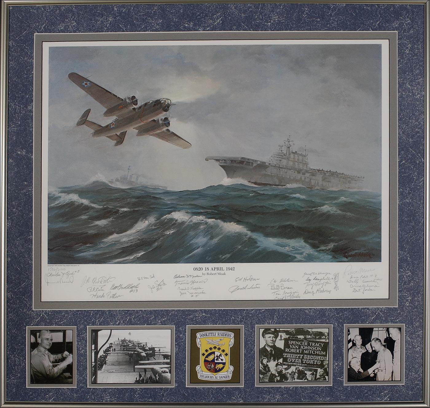 Color limited edition 24.5 x 18.5 print entitled “0820 18 April 1942,” numbered #1596/2000, signed in pencil by 26 members of Doolittle’s Raiders: James H. Doolittle, Charles Ozuk, James Macia, R. E. Cole, Hank Potter, Richard Knobloch, Harry McCool, J. Royden Stork, Charles Nielsen, Travis Hoover, Frank Kappeler, Joe Manske, Ed Horton, Jack Sims, E. W. Holstrom, Bill Bower, Tom Griffin, David Thatcher, Jacob DeShazer, Clayton Campbell, Tung Sheng Liu, Doug Radney, Dave Pohl, Sally Crouch, Charles McClure, and Bert Jordan. Also signed in pencil by the artist, Robert Moak. Double matted and framed with five small photos, to an overall size of 31 x 29.5. In fine condition. Oversized. Pre-certified PSA/DNA and RRAuction COA.