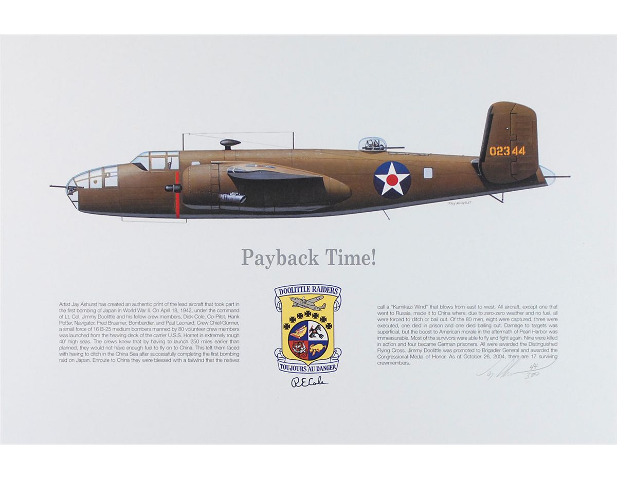 Color limited edition 18 x 12 print entitled ‘Payback Time!’, numbered 44/300, picturing a B-25, signed in black ink by R. E. Cole, and also signed in pencil by the artist, Jay Ashurst; and pencil signatures of David J. Thatcher, Tom Griffin, and Ed Saylor on individual 3.5 x 2 custom-made collector’s cards. In fine condition.
