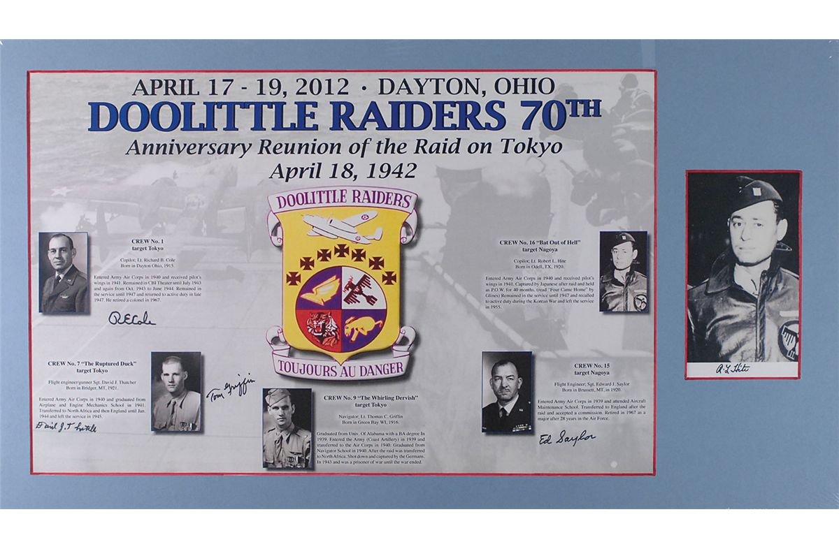Color 18 x 11.75 poster for a reunion of the Doolittle Raiders in April 2012, signed in black felt tip by R. E. Cole, David J. Thatcher, Tom Griffin, and Ed Saylor; and a glossy 3.25 x 6 photo of Robert L. Hite, signed in black felt tip. Matted together to an overall size of 24.5 x 14. In overall fine condition. Oversized.