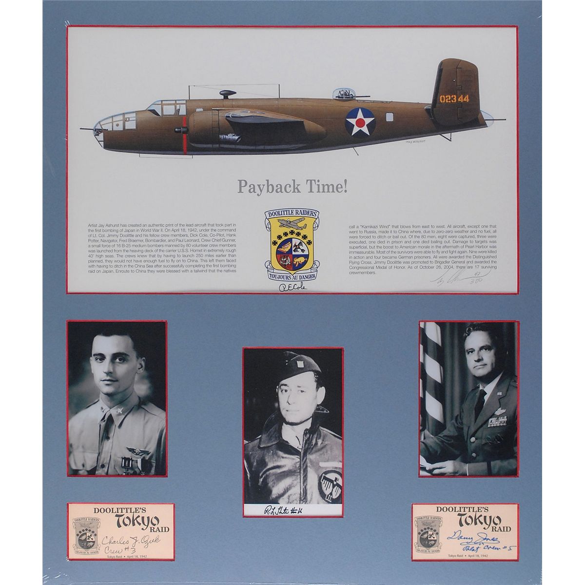 Color limited edition 16 x 9.5 print entitled ‘Payback Time!,’ numbered 47/300, picturing a B-25, signed in black ink by R. E. Cole and in pencil by the artist, Jay Ashurst; a glossy 3.5 x 6 photo of Robert L. Hite, signed in black felt tip; and ink signatures of Charles Ozuk and Davy Jones on individual 3.5 x 2 custom-made collector’s cards. All are matted together to an overall size of 18 x 21. In overall fine condition.