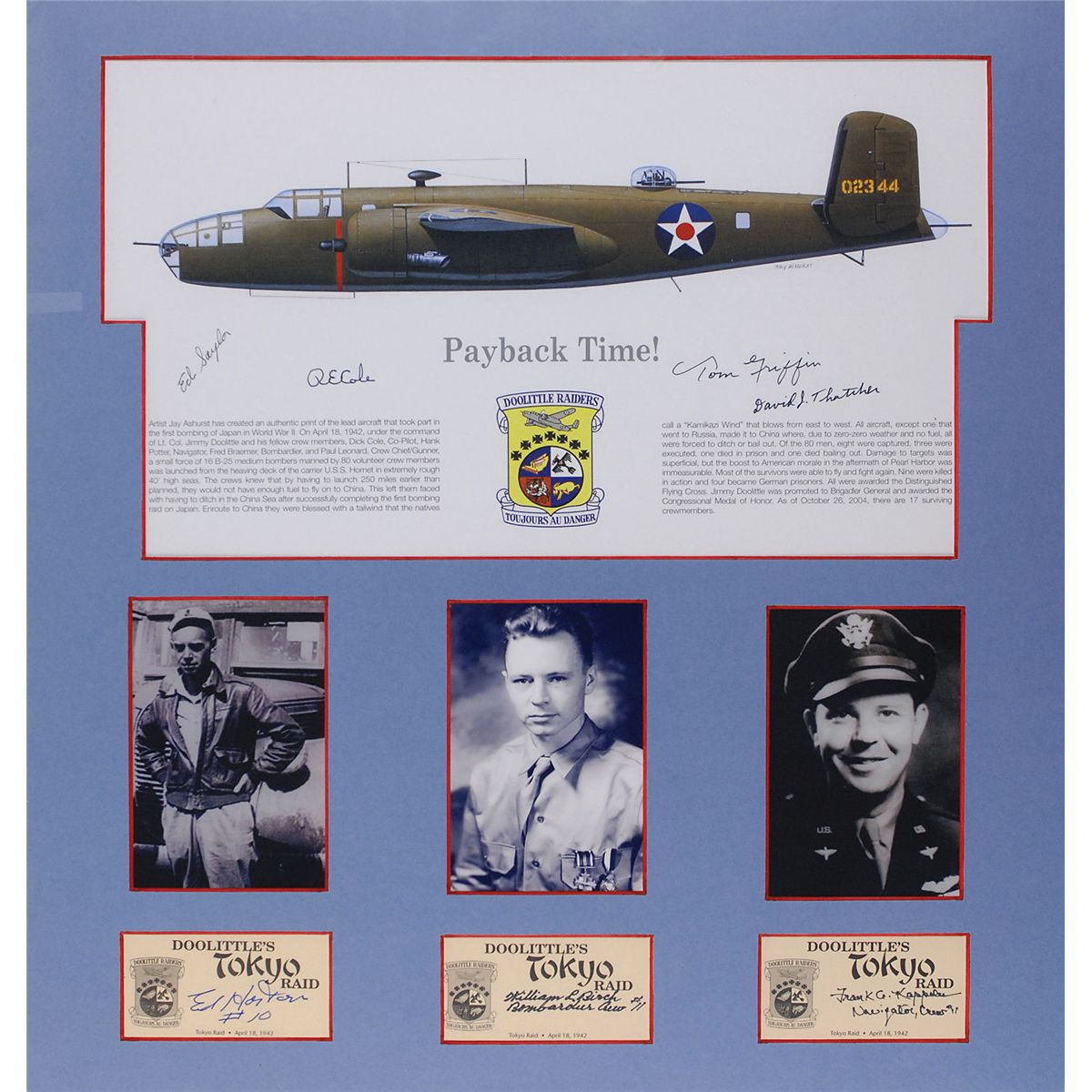 Color 16 x 9.25 print entitled ‘Payback Time!,’ signed in black felt tip by Ed Saylor, R. E. Cole, Tom Griffin, and David J. Thatcher; and felt tip signatures of Ed Horton, William L. Birch, and Frank A. Kappeler on individual off-white 3.5 x 2 custom-made collector’s cards. Matted together with photos of the latter three to an overall size of 19 x 21. In overall fine condition.