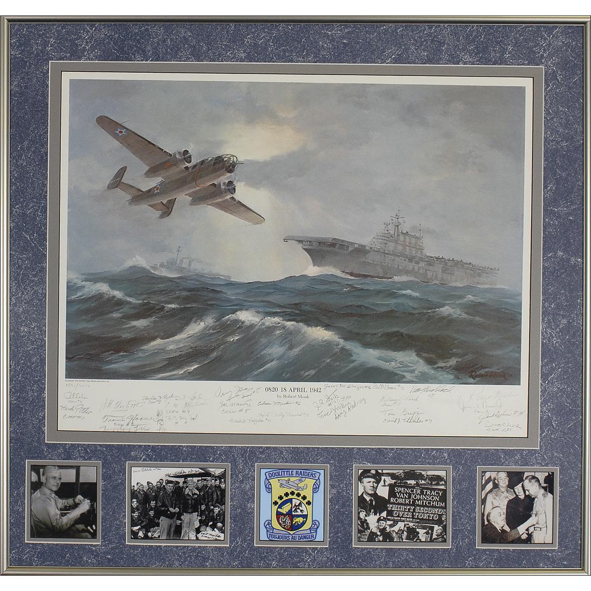 Color limited edition 27 x 21 print entitled ‘0820 18 April 1942,’ numbered #1570/2000, signed in pencil by 27 members of Doolittle’s Raiders: J. H. Doolittle, R. E. Cole, Hank Potter, Travis Hoover, Tung Sheng Liu, Charles Ozuk, Bert Jordan, E. W. Holstrom, H. C. McCool, Davy Jones, Joe Manske, Frank A. Kappeler, Chase J. Nielsen, H. Sally Crouch, Jacob DeShazer, J. R. Stork, Ed Horton, Doug Radney, Bill Bower, William L. Birch, Tom Griffin, David J. Thatcher, Richard Knoblach, James H. Macia, Jr., Jack A. Sims, C. McClure, and Dave Pohl. Also signed in pencil by the artist Robert Moak. Double matted and framed with five photos to an overall size of 31 x 29. In fine condition. Oversized.
