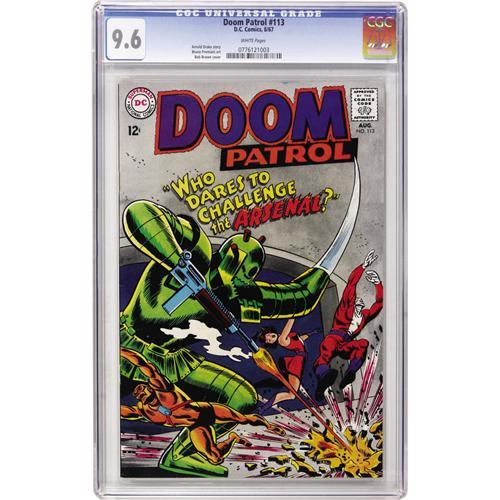 <B>Doom Patrol #113 (DC, 1967) CGC NM+ 9.6 White pages.</B></I> Bob Brown cover. Overstreet 2006 NM- 9.2 value = $60. CGC census 3/07: 3 in 9.6, none higher.<BR><BR><b>Shipping:</b> Comics - Slabbed (certified) (<a target="_blank" href="http://www.heritageauctions.com/common/shipping.php">view shipping information</a>)