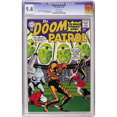 <B>Doom Patrol #91 (DC, 1964) CGC NM 9.4 White pages.</B></I> Bob Brown cover. Overstreet 2006 NM- 9.2 value = $110. CGC census 3/07: 2 in 9.4, 1 higher.<BR><BR><b>Shipping:</b> Comics - Slabbed (certified) (<a target="_blank" href="http://www.heritageauctions.com/common/shipping.php">view shipping information</a>)