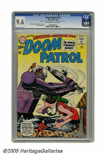 <B>Doom Patrol #93 (DC, 1965) CGC NM+ 9.6 Off-white to white pages.</B></I> Bob Brown cover. Bruno Premiani art. CGC notes, "From the Dallas Stephens collection." Overstreet 2005 NM- 9.2 value = $105. CGC census 2/05: 4 in 9.6, none higher.