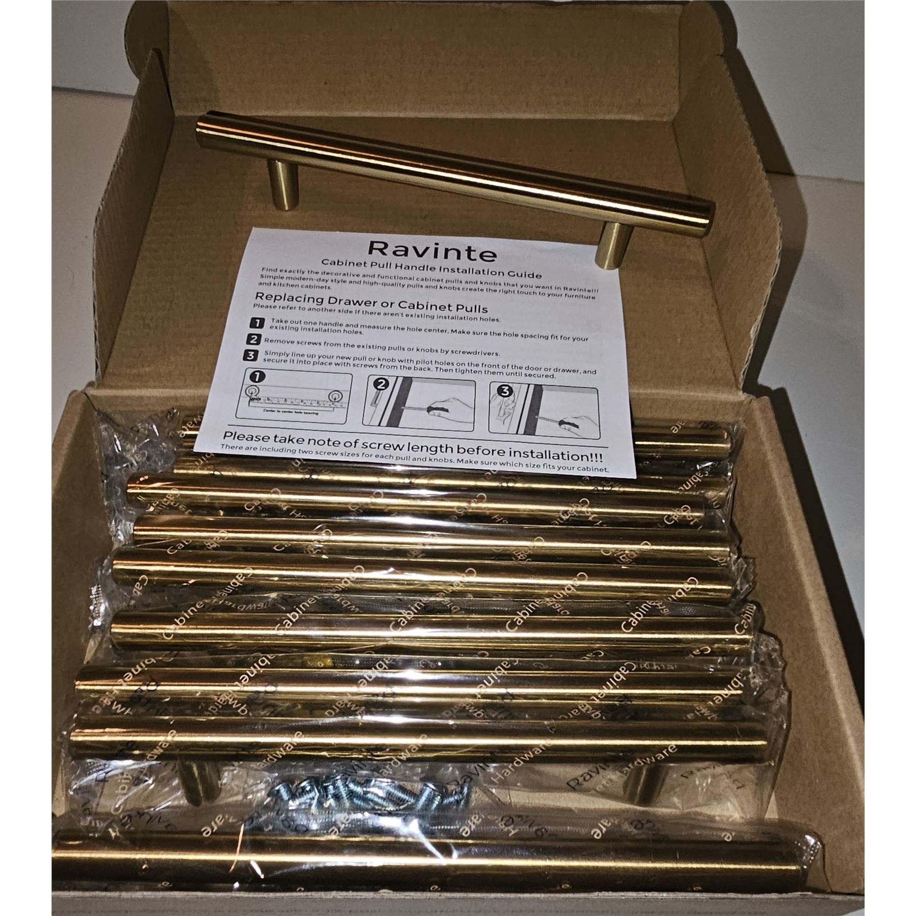 Set of sleek, gold-colored metal pull handles for cabinets and drawers, installation guide included, new condition.